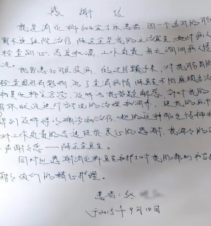 近日,消化内一科收到一份特别的“礼物”——一封来自患者手写的感谢信。信纸虽薄,却字字滚烫,字里行间承载了患者赵女士对主治医生陈金金的深切感激,生动诠释了我院医护人员“以患者为中心”的服务初心。