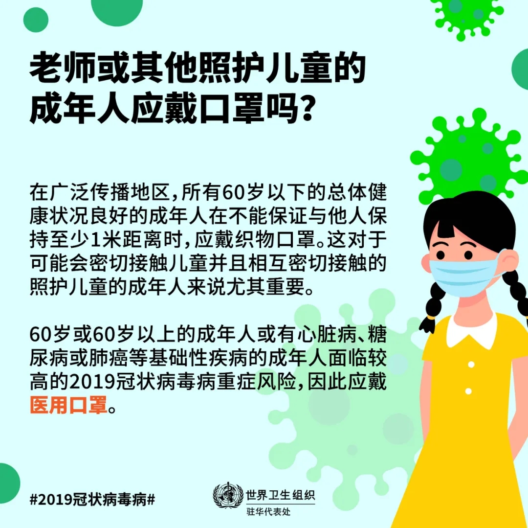 - 儿童与其他面临重症高风险的人(如老年人和有其他基础性健康问题的人)进行互动的特定场所和行为 。 世卫组织和联合国儿童基金会建议,尤其在无法保证与他人保持至少1米距离,并且当地存在广泛传播问题的情况下,12岁及12岁以上儿童应佩戴口罩,其佩戴口罩的条件与成年人相同。