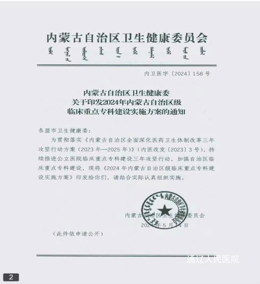 2024年5月,自治区卫生健康委员会下发的关于2024年内蒙古自治区级临床“重点专科建设名单”里,我院心血管内科经过层层审核,凭借卓越实力成功获得自治区级临床重点建设专科提名。