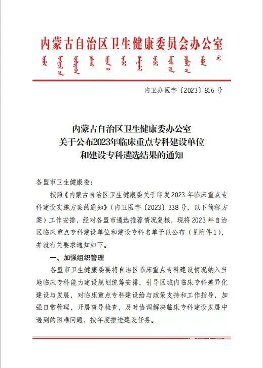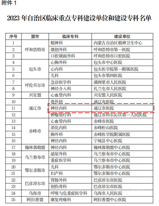 根据《内蒙古自治区卫生健康委办公室关于公布2023年临床重点专科建设单位和建设专科遴选结果的通知》,我院神经内科成为“内蒙古自治区临床重点建设专科”,这一荣誉不仅彰显了通辽市人民医院神经内科在医学领域的卓越实力,更是对医院整体医疗服务水平的一次高度评价。