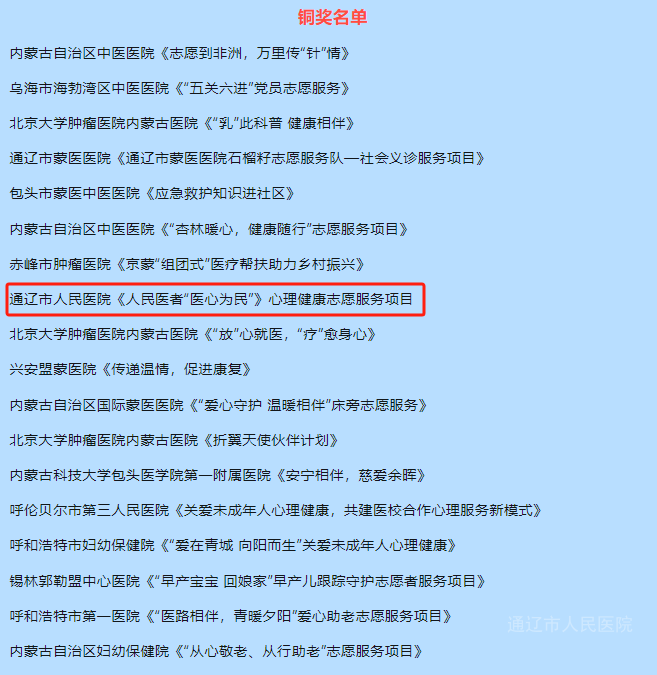 近日,由自治区卫生健康委主办、自治区人民医院承办的全区卫生健康系统2024年青年志愿服务项目大赛暨青年志愿服务交流会在呼和浩特市举行。经前期申报、项目审核,我院开展的“人民医者‘医心’为民”心理健康志愿服务项目入围大赛路演,并荣获铜奖。