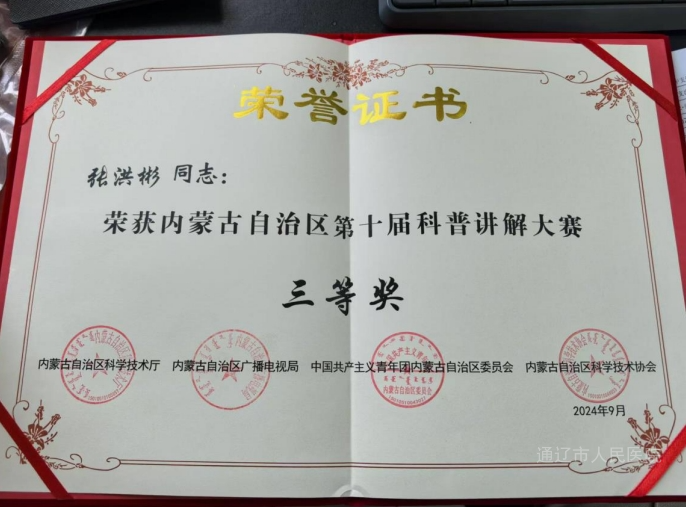 近日,通辽市人民医院科普教育基地传来喜讯,选派代表张洪彬在连续两项科普讲解大赛中表现优异,分别斩获内蒙古自治区第十届科普讲解大赛三等奖和通辽市首届职业科普大赛二等奖,这一佳绩不仅体现了其个人的专业素养和出色表现,更彰显了医院在科普教育工作方面取得的显著成效。