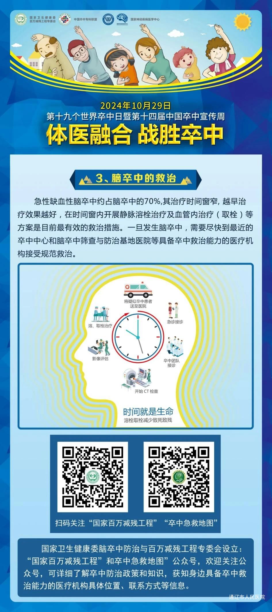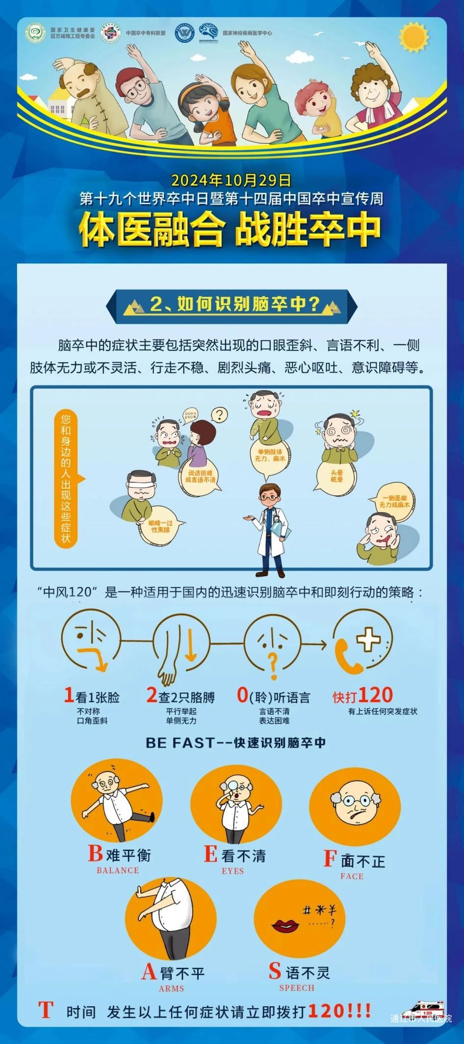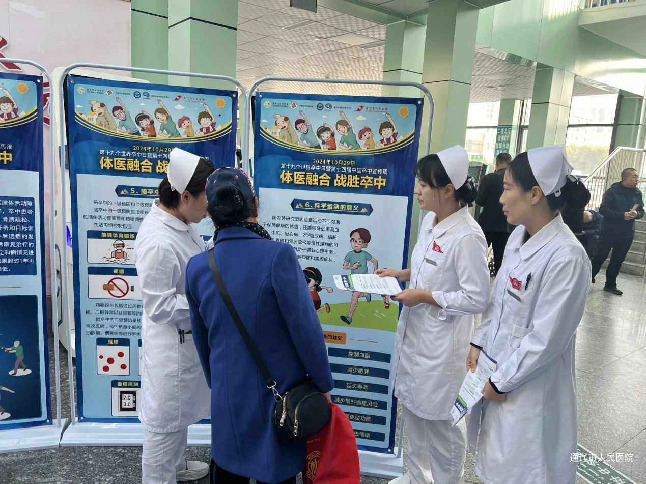 2024年10月29日是第19个“世界卒中日”。为提高公众对卒中早期识别的意识与技能,了解卒中的预防急救和康复知识,认识到卒中急救、治疗的重要性,我院卒中中心医护团队联合胸痛中心、神经内科、神经外科、心血管内科、急诊科、门诊部等多个学科专家团队开展主题为“体医融合 战胜卒中”健康科普义诊活动,旨在倡导科学运动和健康生活方式,帮助大家树立“运动是良医”的健康理念。