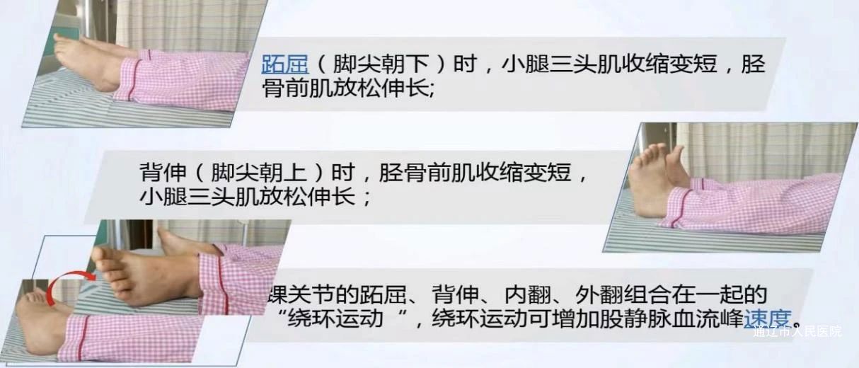 该专科品牌服务项目推出——踝泵运动。踝泵运动是指患者通过主动屈伸活动踝关节,以起到加速下肢血液循环作用的活动。踝泵运动分为屈伸和环绕两组动作(如下图)。