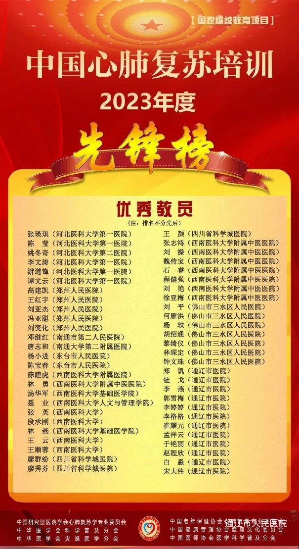作为国家首个成立的中国研究型医院学会心肺复苏学专委会,会上对中国特色心肺复苏“三立”发展战略(立心肺复苏科学理论之言、立心肺复苏科技转化之基、立心肺复苏科普惠民之众)中取得骄人成就并默默奉献、辛勤耕耘的单位及医者进行了表彰。我院凭借在心肺复苏培训方面的卓越表现,获评【国继教】2023中国心肺复苏培训十佳优秀中心,王栓宏荣获中国心肺复苏培训突出贡献奖。与此同时,大会发榜表彰2023年度中国特色心肺复苏培训的优秀中心、优秀教员、优秀学员中我院多人上榜。