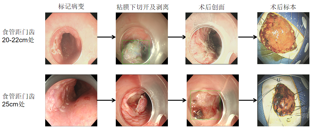 手术前,庞慧芳借助共聚焦显微内镜与放大碘染技术全面精查评估。尽管食管中段病理初判为炎症,但经共聚焦显微内镜观察,仍发现细胞异型性。随后,在麻醉科医生姜曼气管插管支持下,庞慧芳在放大内镜及共聚焦显微内镜的精准导航下,对两处病变进行标记,成功完成ESD手术,完整剥离病变组织。术后病理显示,两处病灶均为早期中分化鳞状细胞癌伴高级别上皮内瘤变,其中中段癌变直径仅2毫米,浸润至黏膜肌层,切缘干净,达到治愈性切除标准。