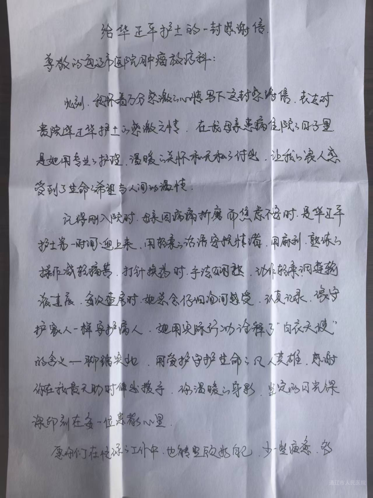 近日,我院肿瘤放疗科收获了一份特殊而珍贵的“出院礼物”——一封患者家属亲笔书写的感谢信。字里行间饱含深情,不仅是患者家属对科室的诚挚致谢,更勾勒出医患之间温暖动人的情谊画卷。
