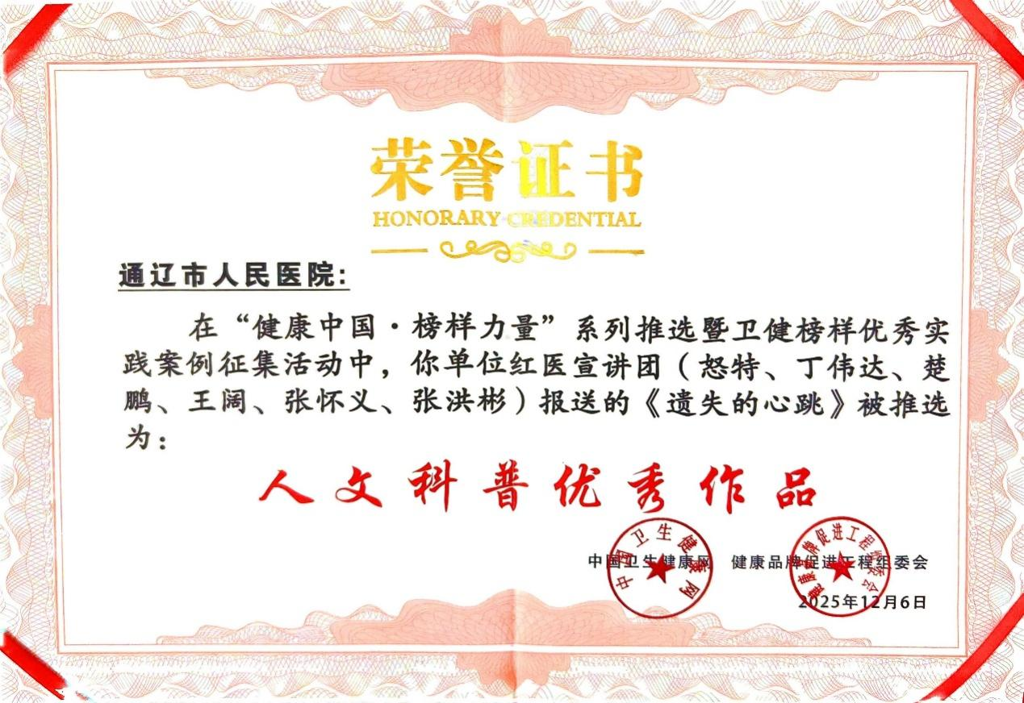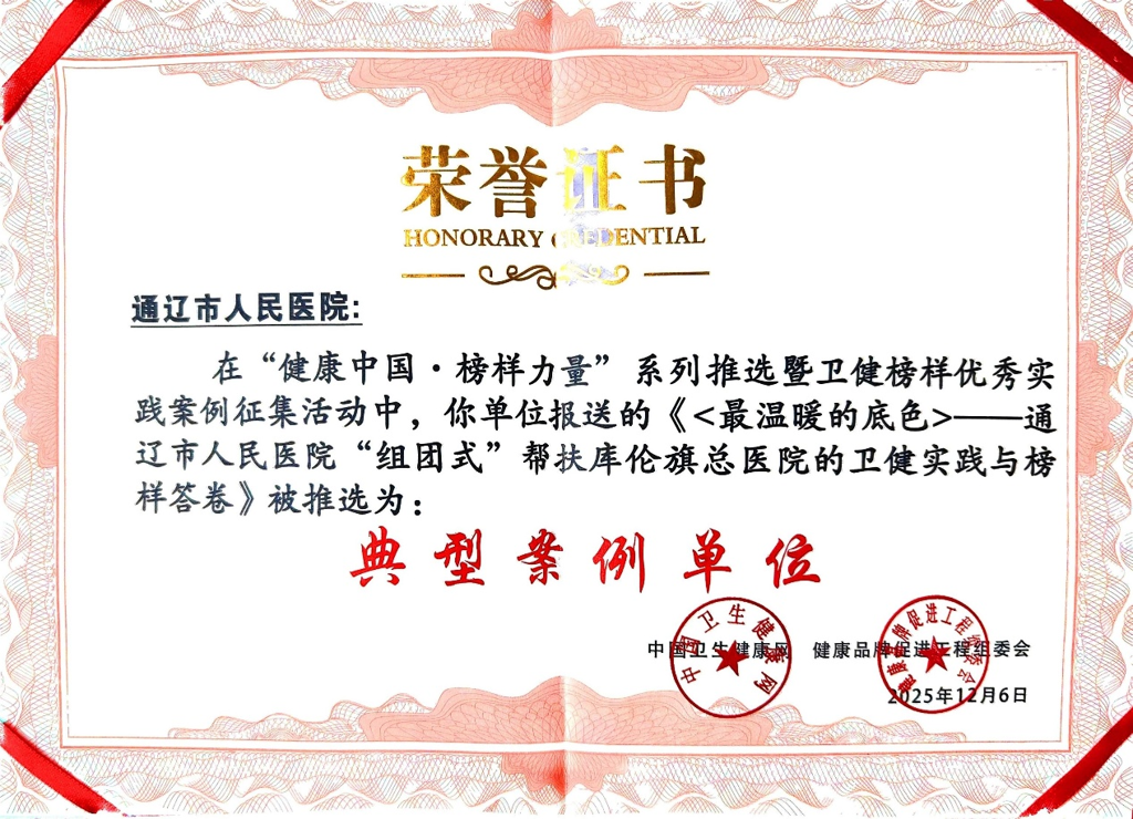 近日,中国卫生健康网与健康品牌促进工程组委会联合主办的“健康中国・榜样力量”系列推选暨优秀实践案例征集活动圆满落幕。我院凭借基层医疗帮扶与健康人文科普领域的突出成就,斩获两项重磅荣誉:《〈最温暖的底色〉——通辽市人民医院“组团式”帮扶库伦旗总医院的卫健实践与榜样答卷》获评“典型案例单位”,人文科普舞台剧《遗失的心跳》当选“人文科普优秀作品”,以双标杆实践为健康中国建设贡献草原医者力量。