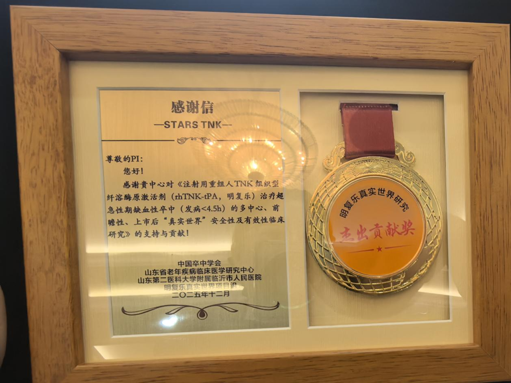 《注射用重组人TNK组织型纤溶酶原激活剂治疗超急性期缺血性卒中的多中心、前瞻性、上市后真实世界临床研究》是一项全国范围的大型重点研究项目,旨在评估新型溶栓药物在真实临床环境中的安全性与有效性,对指导我国卒中超早期救治实践具有重要意义。我院卒中中心自参与该项目以来,凭借规范高效的绿色通道流程、严谨的科研数据质量控制以及显著的病例入选贡献,获得项目组高度认可。