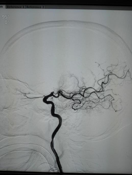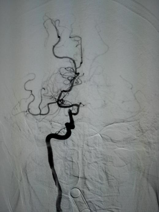 与患者家属沟通后立即于导管室行全脑血管造影术,术中提示右侧颈内动脉末端闭塞,TIMI分级为0分(完全闭塞)。萨仁格日乐主任医师与徐鹏主治医师与患者家属沟通,考虑患者发病特点,行支架取栓术。术中利用取栓支架(Solitaire 4mm×20mm)反复通过闭塞处取栓,前后共五次,最终手术成功,患者闭塞处血运再通。
