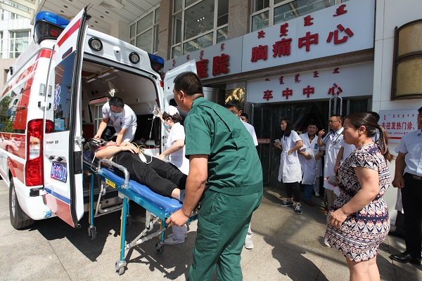 29日上午9时30分,我院急诊科接到120指挥中心指示,天骄城小区19号楼前,一名44岁男性患者出现胸痛胸闷现象,持续10分钟无缓解,请求救治。接到命令后,医院迅速反应,调派救护车前往事发现场,医护人员抵达事发现场后,立即了解患者情况,诊断为胸痛,随即将患者转移至救护车、固定,在运送患者至医院过程中采取心电图检查等措施,并将检查结果实时传送至胸痛中心,以便在胸痛中心医生的指导下进行术前用药。9时59分,救护车抵达医院,医护人员火速投入到抢救患者的工作中,分诊、胸痛中心医师接诊、心血管内科医师会诊、一键启动导管室、送入心内科CCU病房。“绕行CCU”应急演练结束。10时30分“绕行急诊和CCU”路线的应急演练开始……