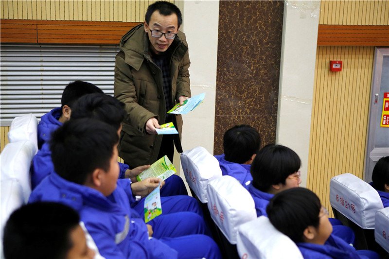 图为预防保健科工作人员向同学们发放健康知识折页