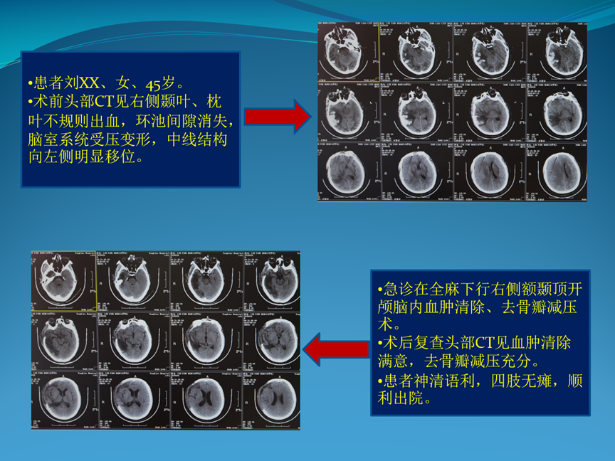 刘XX,女,45岁,高龄剖宫产后2次妊娠,高血压3级,胎盘早剥,大出血,失血性休克,由下级医院转至我院产科,产科黄立强主任团队急诊行剖宫产术,术后新生儿状态良好,产妇病情危重,转入东院ICU科继续抢救,生命垂危,深昏迷,呼吸机维持呼吸,瞳孔散大,光反射消失,贫血,血小板3万,头部CT:颅内大量出血,量约80ml,脑肿胀、脑疝。医务科王树碧科长立即组织全院会诊,病情危重,随时有可能呼吸、心跳停止,但手术风险高,血小板低至3万,术中止血困难,术后再出血,DIC,可能出现多脏器功能衰竭。王树碧科长听取各科会诊意见后,当即决定,虽然病情危重,手术风险高,但是手术是唯一抢救病人的希望,我们作为本地区三级甲等医院,应勇于承担风险,再次给予输注血小板、红细胞、新鲜血浆,充分于家属沟通,同意手术,决定由西院神经外科团队实施手术,再东院手麻科的密切配合下,急诊在全麻下行去骨瓣减压颅内血肿清除术,手术顺利,经术后精心治疗,病人恢复顺利,神清语明,下床活动正常,近日已痊愈出院。
