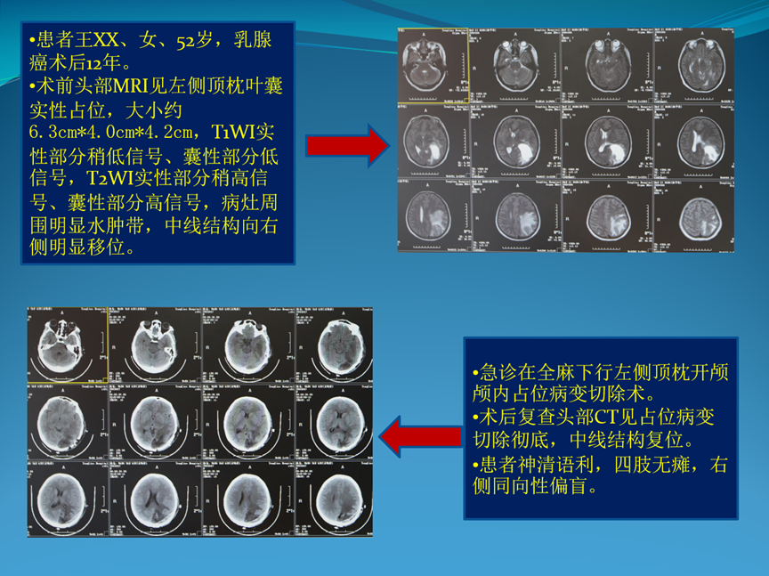 王XX,女,51岁,左枕叶占位、脑疝,急诊入院时已呼吸停止,立即气管插管,呼吸机维持呼吸,加强脱水,阅片定位,剃头、消毒,行肿瘤囊性部分微创穿刺引流,抽出囊液30ml,病人自主呼吸恢复,呼吸3-5次/分,继续呼吸机维持呼吸,充分与家属沟通,急诊手术是抢救生命的唯一希望,家属理解病情危重,手术风险高,坚决要求手术,请示医务科张双福科长,张科长指示:手术指证明确,病情危重,呼吸机维持呼吸,已向家属充分沟通同意手术,我们应勇于担当,立即手术,抢救生命,在西院手麻科的密切配合下,在全麻下行左顶枕开颅颅内占位切除术,手术顺利,术后病人自主呼吸恢复,脱机血氧饱和度良好,术后第3天病人完全清醒,神清语明,现术后1周病人已下床活动,恢复良好。