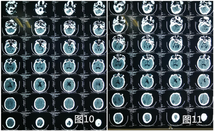 目前患者神清,可正确应答,左侧肢体肌力1级,积极康复治疗中。术前CT(图10),术后第四天CT(图11)。