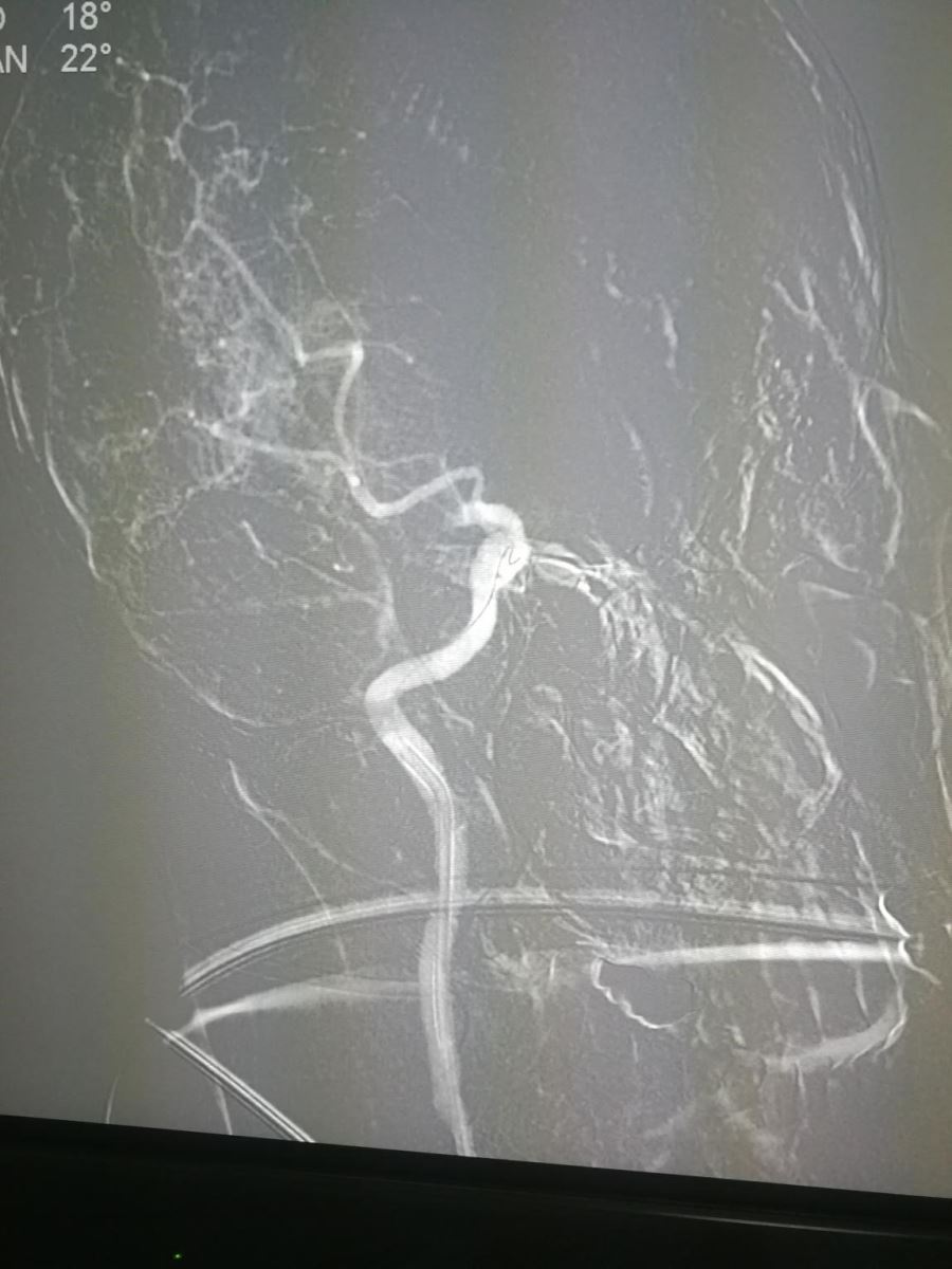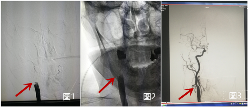 因患者到我院在发病时间窗内(<4.5h),与患者家属谈话征得其同意后,急诊立即给予阿替普酶(rt-PA)静脉溶栓,同时直接将患者送入导管室,桥接行全脑血管造影术(DSA),提示右侧颈总动脉末端闭塞(图1、2)。因患者半年前于我科行全脑血管造影术提示右侧颈内动脉未见异常(图3),此次突然发病,考虑心源性栓塞。此类栓子溶栓效果差,造影也提示溶栓无效果,积极给予支架取栓治疗。