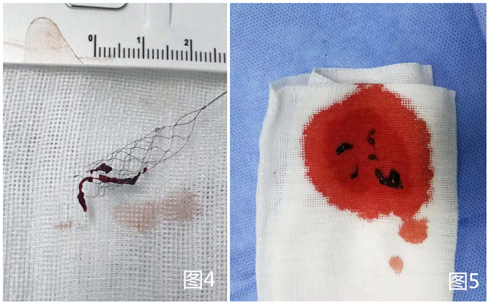 应用抽吸方法以及支架Solitaire(6mm×20mm)取栓,可见大部分血栓取出(图4、图5),
