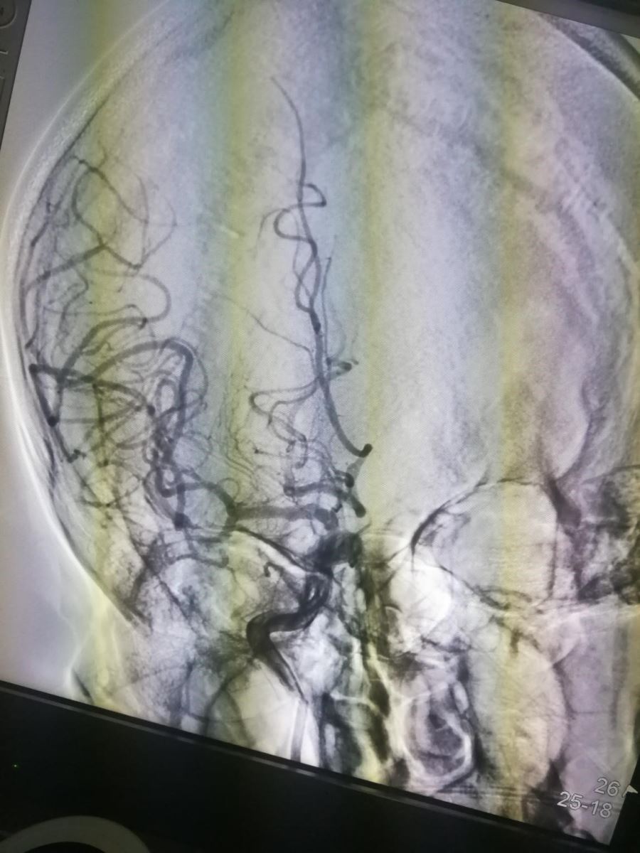 但小部分血栓向远端移动,堵塞右侧大脑中动脉(图6),如右侧大脑中动脉不能开通,患者预后仍会较差。