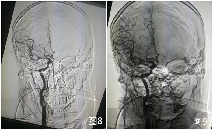 术后再次造影,可见右侧颈总动脉完全通畅(图8、图9)。