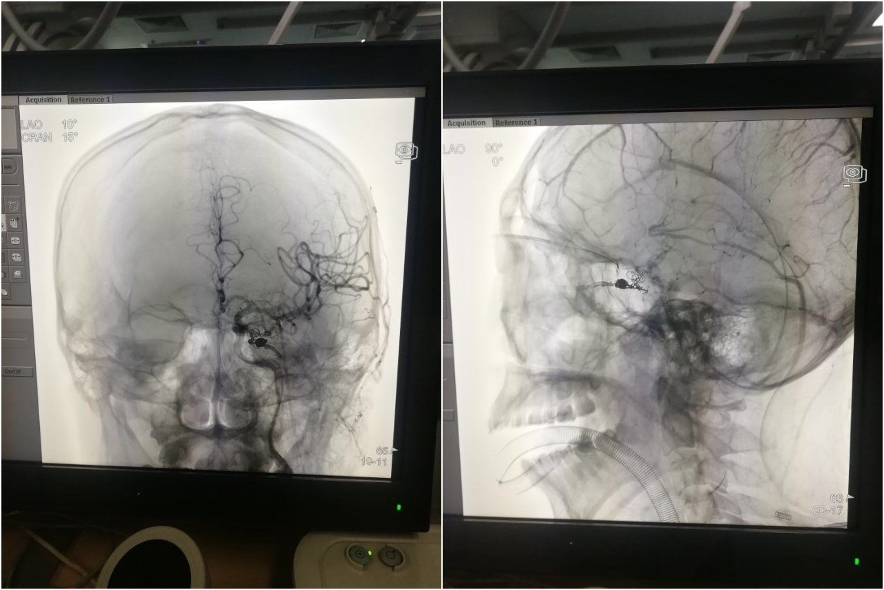 患者包某,男,23岁,16个月前出现左耳杂音,7个月前自觉左眼逐渐突出,且随时间推移病情加重,出现视力下降、左眼肿胀疼痛等现象。我院神经外科医生通过患者主诉、体征和辅助检查,诊断患者为左侧海绵窦区硬脑膜动静脉瘘,决定为患者实施海绵窦区硬脑膜动静脉瘘栓塞术。手术过程中,神经外科医护人员应用Seldinger穿刺技术将6F导管鞘置入右侧股动脉内,在导丝导引下将6F导引导管送至左侧颈总动脉、颈内动脉、颈外动脉分别造影,造影过程中影像清晰显示患者为左侧海绵窦区硬脑膜动静脉瘘。然而正在此时,这台手术中最大的难题出现了,医生先后尝试通过颈内动脉、颈外动脉通路、经面静脉——眼上静脉通路、岩下窦——海绵窦入路,但是这几条通路有的过于狭窄,微导管无法通过;有的过于迂曲,微导丝和微导管无法顺利就位。此时,距离手术开始已经过去六个小时,神经外科团队启用了预定的最后一套方案,那就是经眶上切开眼上静脉入路。功夫不负有心人,这一次果断的尝试令通路成功建立,微导管顺利到位,医生先取弹簧圈填塞海绵窦动静瘘区后,缓慢注入ONYX胶栓塞瘘口,直到瘘口彻底闭合,术后造影显示,患者瘘口完全消失,供血动脉均未受到任何影响,这台历时七个半小时的手术取得圆满成功!据主刀医师张永哲介绍,患者经济条件差,如术前经静脉入路的预案全部失败,需经传统的动脉入路进行手术,很可能需要两次或多次治疗才能痊愈,这无疑是对患者身体和经济的双重打击。最终大家不负众望、攻坚克难,以最小代价顺利完成手术,意味着我院神经外科团队不但在这台“拉锯战”式的疑难手术中展示了高超的技术和卓绝的意志力,更体现了医者仁心的高尚情怀。