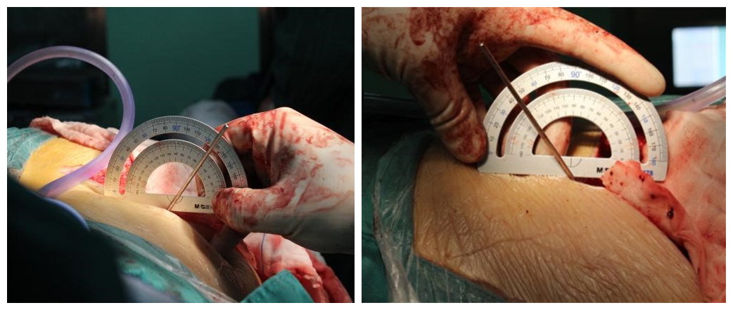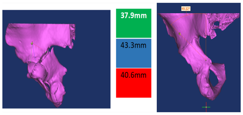 我们应用软件自动建立虚拟骨盆三维仿真模型,应用相关软件功能模块建立虚拟圆柱体替代拉力螺钉,将虚拟圆柱体置入髋臼前柱骨质内,逐渐增大虚拟圆柱体的直径直至髋臼前柱骨质边缘,在三维层面中记录虚拟圆柱体的直径及长度,并测量入钉点与相关髋臼解剖结构的距离,测量虚拟圆柱体的入钉角度及螺钉在骨盆正位、入口位与骨盆正中线的夹角。在得到精准的螺钉入点、长度、角度等测量值后,为术中置钉提供了较为重要的参考价值。