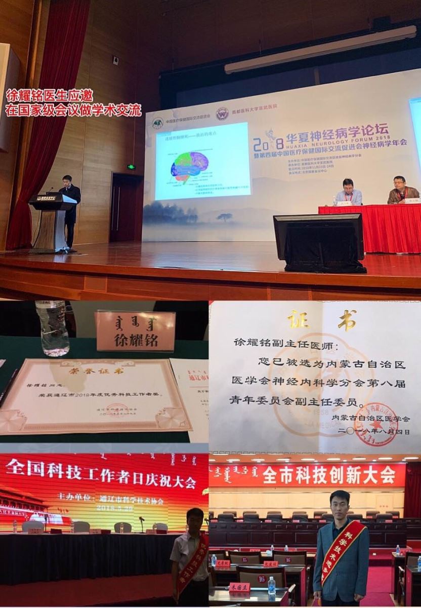 徐耀铭医生于 2015年晋升为通辽市医院神经内科副主任医师;2016年获得通辽市科技进步奖,2017年考取首都医科大学宣武医院神经内科博士研究生,2018年获通辽市优秀科技工作者,2018年被评为内蒙古医学会神经内科分会青委会副主任委员,同年被内蒙古医科大学遴选为硕士研究生导师,同时还是国内多家核心期刊的审稿专家。目前发表中文核心期刊10余篇,SCI1篇,主持内蒙古自治区科技计划项目1项,2019年元月与张国锋医生共同为通辽市医院神经内科的脑血管介入工作刷新历史新成绩,这些在我院神经内科领域的贡献非常显著和必要的,极大的完善了学科建设及人才建设的不足,徐耀铭医生目前是我院神经内科第一个医学博士和第一个硕士研究生导师,也是我院神经内科迄今为止发高质量文章最多的医生。这一点点成绩的积累无不是理想与 践行相结合的证明,无不是甘于爱岗敬业勇于探索的证明,无不是为通辽市医院神经内科崛起壮大而持续奋斗的证明。