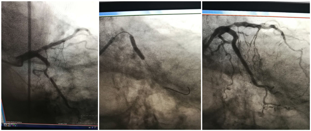患者慕某,男性,72岁,冠心病心肌梗死支架植入术后5年,此次主因一过性晕厥一个月入我院心内一科治疗,经神内三科会诊,进行头颈部CTA检查提示右侧颈椎动脉闭塞、右侧锁骨下动脉重度狭窄,对颅内供血造成严重影响。为尽快解决患者病痛,在心内一科宝云龙主任、神内三科杨卫东主任的支持与指导下,两个科室联合会诊、认真讨论,决定于4月10日晚由神内三科徐鹏医生主刀为患者进行右侧锁骨下动脉支架植入术,随后由心内一科郑崔成医生施行冠状动脉造影确定患者心脏血管具体情况。两位主刀医生周密计划,详尽准备,手术顺利进行。不出所料,术中发现患者冠状动脉回旋支同样重度狭窄,随时有发生心梗的可能,郑崔成医生在与患者家属充分沟通后,随即进行冠脉支架植入术,开通濒临闭塞的血管。术后患者头晕、胸闷等症状消失,恢复良好,用患者家属的话说:“整个人都精神了”,家属对我院心内一科与神内三科团队一再表示感谢。