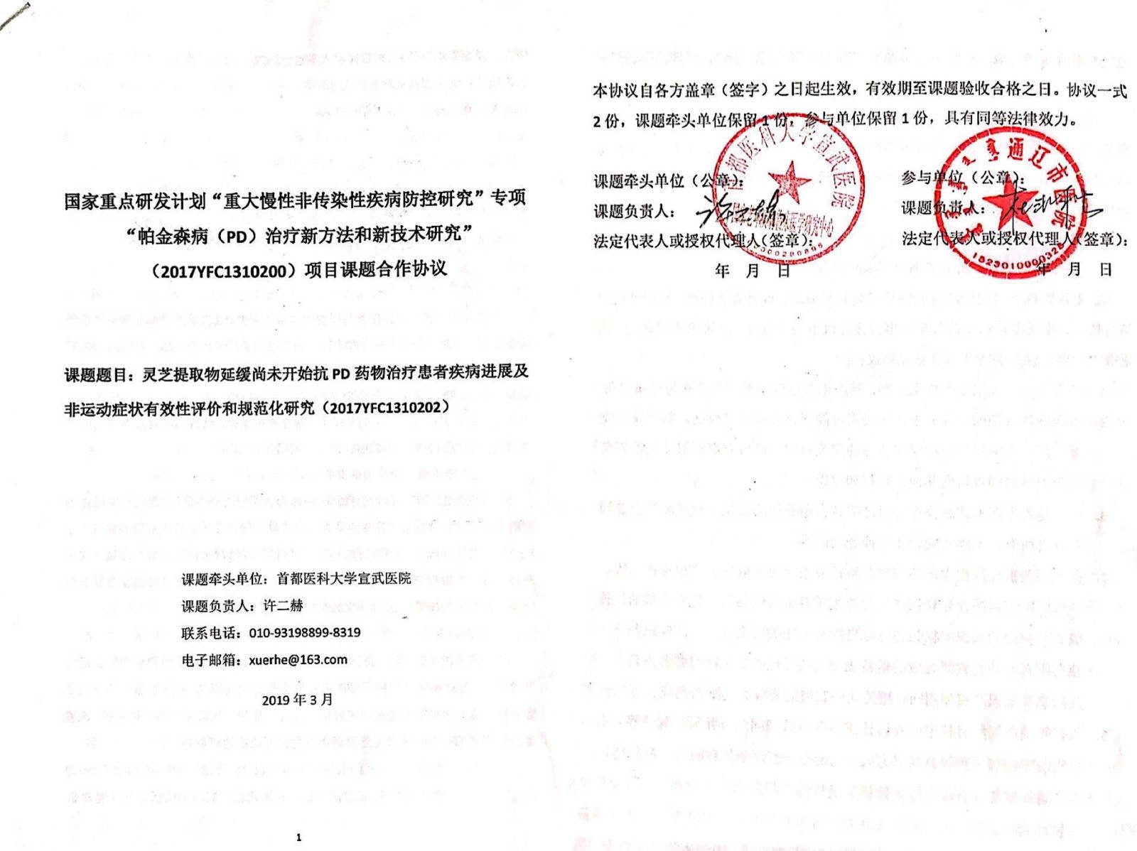该课题基于多个临床中心建立未接受治疗的疑似和早期帕金森病患者队列,开展疾病早期神经保护治疗的前瞻性研究,探索并验证灵芝提取物对疑似和早期帕金森病患者的神经保护作用,从延缓运动症状进展、改善非运动症状等多方面评估灵芝提取物作为长期治疗的效益。试验全程共计72周。合作开始后,我院将严格按照课题方案要求填写病例报告表,及时将相关数据录入电脑并上传,完成对病人的随访,并完整录入临床信息的病例报告表。