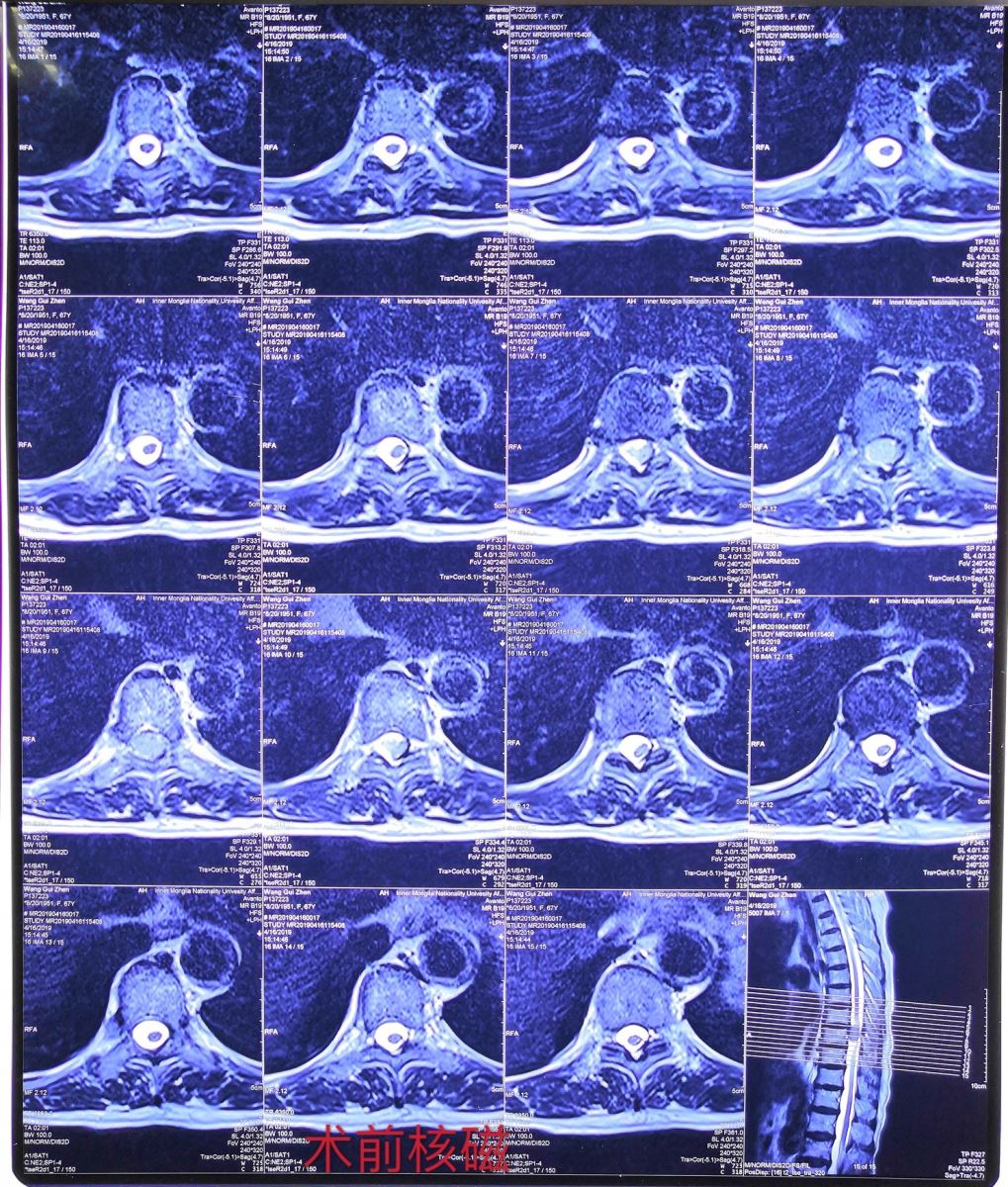 患者女性,67岁,日前出现双下肢不全瘫,同时伴有双下肢痛觉、触觉等感觉减退症状,辗转我市其他医院治疗无果后,来我院骨四科就诊。骨四科燕飞主任详细询问了患者病史资料及相关检查结果,认真为其查体诊断,考虑是椎管内肿瘤压迫脊髓导致患者出现了严重症状。燕飞主任随即安排患者入院治疗,住院后进一步完善检查,核磁共振影像提示患者胸8水平髓外硬膜内脊膜瘤。诊断明确后,燕飞主任亲自组织全科反复讨论制定诊疗方案。最终“后路胸椎椎板切除、髓外硬膜内脊膜瘤切除、植骨椎弓根钉内固定术”得到大家的一致认可。此手术方式具有髓外硬膜内肿瘤切除彻底、脊髓减压充分、脊柱稳定重建良好等优点,能够彻底解决患者疾患。脊柱椎管内肿瘤的治疗历来是脊柱外科的难点,髓外硬膜内肿瘤的手术风险更是巨大,稍有不慎若触碰到“娇嫩”的脊髓,就会导致患者终身瘫痪,对术者的技术水平要求非常高。