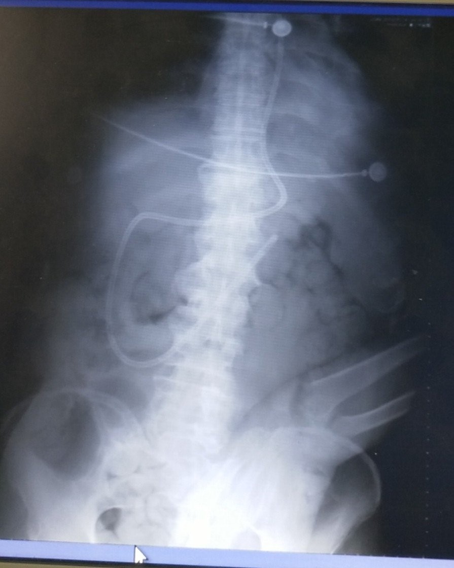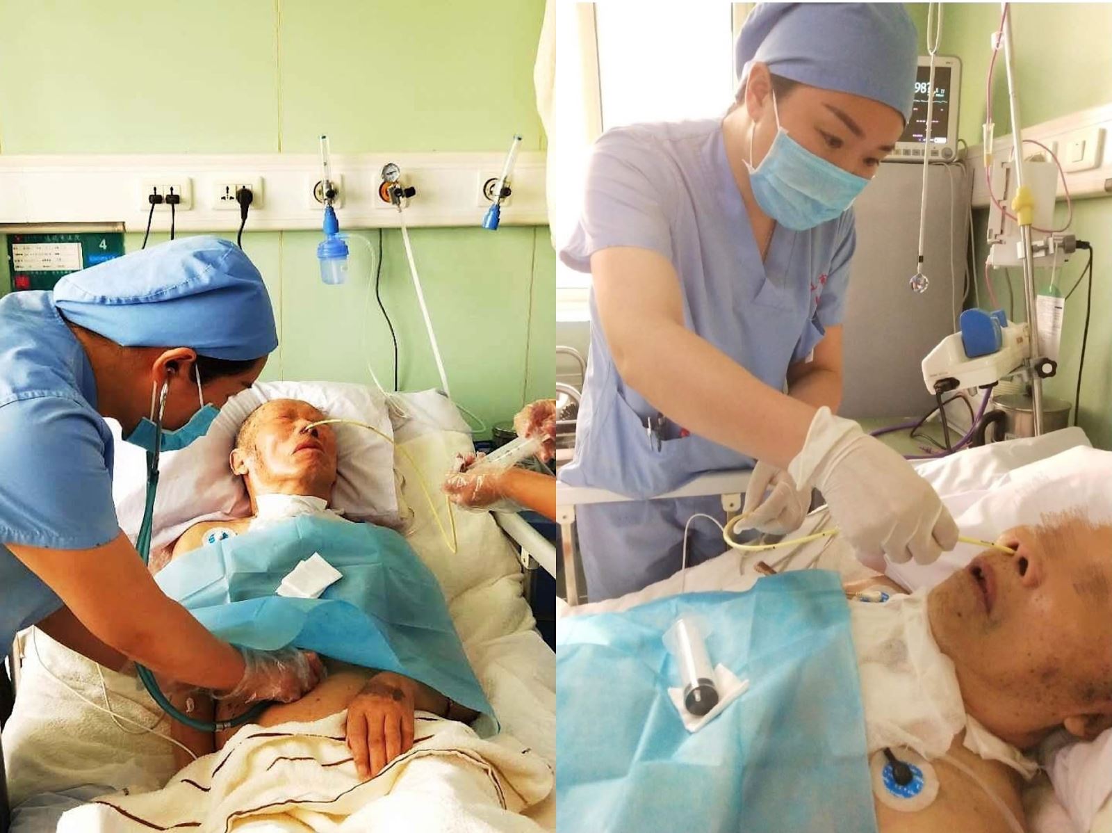 85岁男性老年患者,因“脑出血后遗症”合并肺炎,收治入院。老人病史现已气管切开,吞咽功能消失,不能经口进食,长期胃管喂养出现腹胀反流,只能靠静脉营养补充热量,这使老人身心饱受煎熬。对于危重患者来说,在血流动力学稳定后,尽早启动肠内营养是促进患者度过危重期的必要条件。考虑患者目前身体状况,床旁盲插鼻肠管,是满足患者肠内营养进食需求的最理想途径,在与主管医生和家属沟通后,由ICU护士长栗春杰为老人实施床旁盲插经鼻空肠营养管植入技术,整个过程非常顺利,患者目前生命体征平稳,治疗效果非常明显。