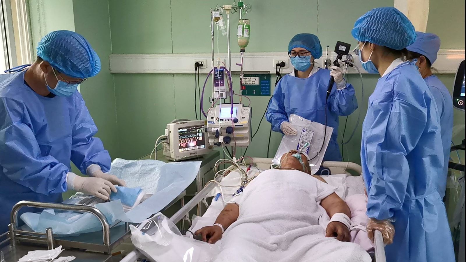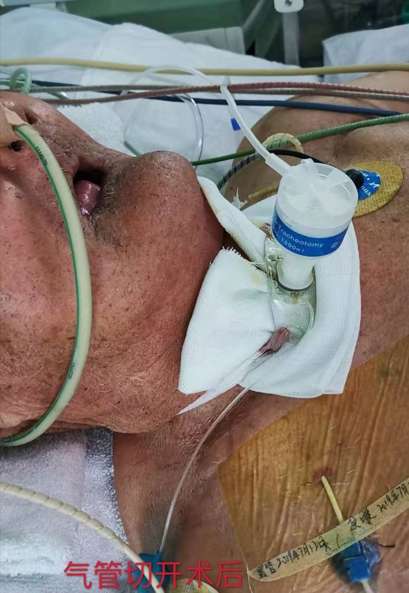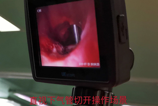 患者是一位高龄老人,患大面积脑梗入住我院东区ICU,因患者病情危重,神志不清,机械通气脱机拔管困难,排痰无力,必须行气管切开置管建立人工气道,但老人颈部条件较差,既往有气切病史,颈部切口瘢痕较大,为确保手术安全,曹新林主任在患者家属同意的情况下,决定大胆挑战新技术,为患者实施支气管镜引导下经皮气管切开术,手术顺利,术后病人恢复良好。