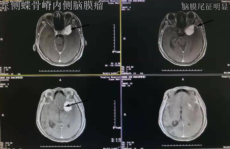 患者,女,60岁,近期因阵发性抽搐,严重影响日常生活,入我院西院区神经外科进行治疗。经查体,发现神经系统正常,但有重度高血压症;头部核磁检查后发现,左侧鞍旁、左侧颞部占位性病变,不均匀增强,邻近脑膜明显强化,诊断为左侧蝶骨嵴内侧脑膜瘤。本着“以患者为中心”的服务理念,西院区神经外科团队反复讨论病情,在征得患者家属同意后,决定为患者进行蝶骨嵴内侧脑膜瘤显微切除术。手术由秦义民主任亲自主刀,在全麻下为患者实施“经左侧额颞入路左侧蝶骨嵴内侧脑膜瘤切除术”。术后,患者康复状况良好,神清语利,视力视野正常,四肢活动自如,神经系统完全正常。