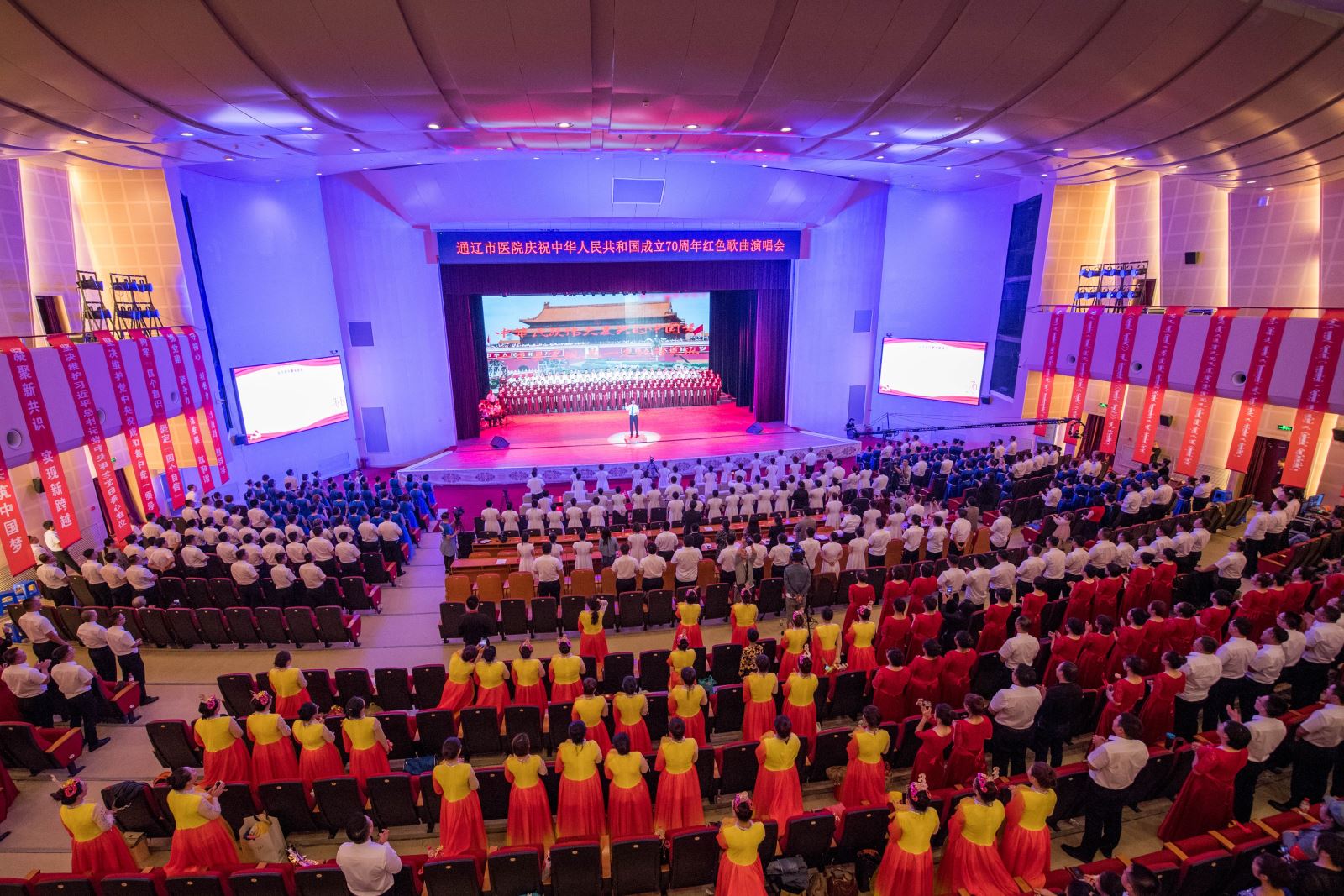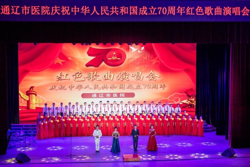 恢宏的舞台,美妙的音符,澎湃的心情,嘹亮的歌声,全体演职人员为祖国70华诞献上了一场视听盛宴。通过红色歌曲的演唱,充分展现了通辽市医院人蓬勃向上的精神风貌,坚定不移的信念与梦想,我们将继续紧密团结在以习近平同志为核心的党中央周围,不忘初心、牢记使命、改革发展、砥砺前行,为创造美好生活,实现中华民族伟大复兴的中国梦而努力奋斗。我们将在医院新一届领导班子的带领下,以前所未有的凝聚力和向心力,发扬通辽市医院人团结协作,锐意进取的优良传统,坚守白衣天使的神圣职责与光荣使命,为通辽及周边地区百姓的健康保驾护航!