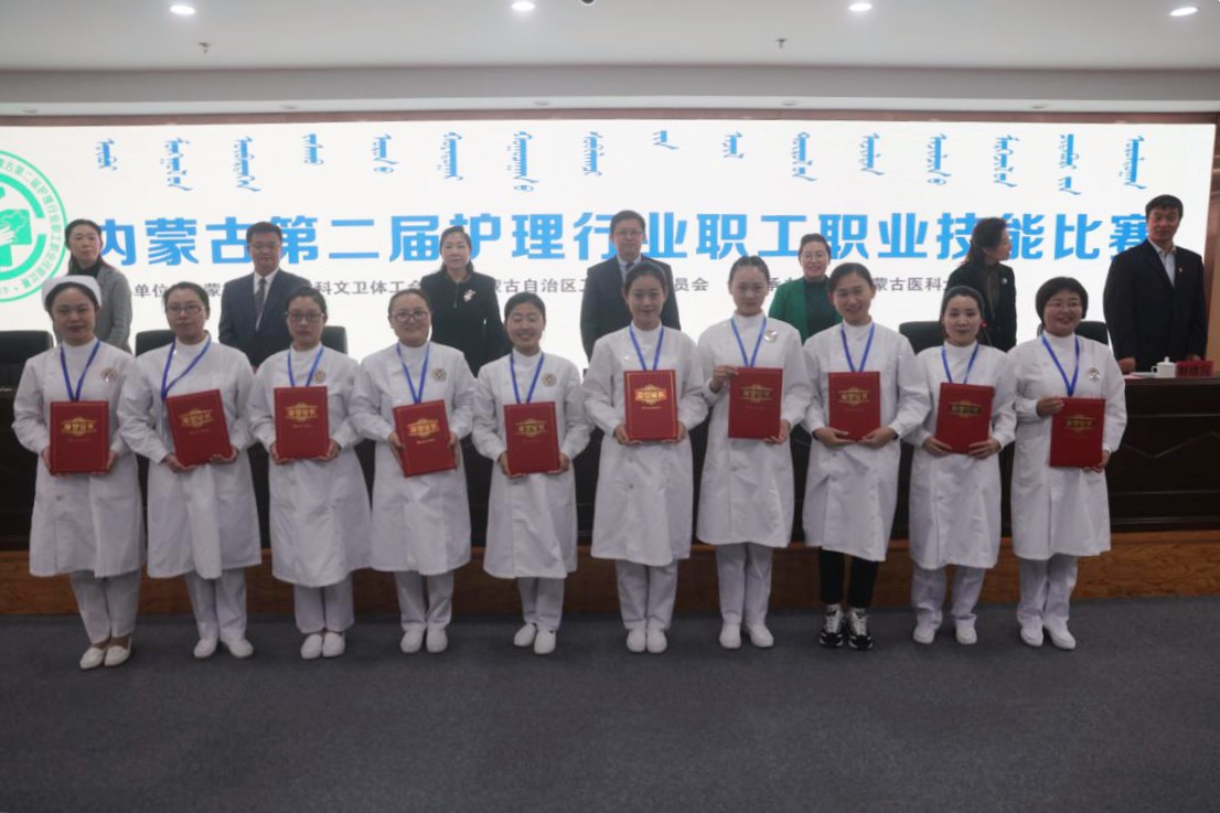 据悉,本次护理技能竞赛共有来自自治区卫生健康委员会直属医院和全区各盟市地区13支参赛队的120名选手参加比赛,设内科护理、外科护理、儿科护理、急诊急救护理4个项目,各比赛项目由理论知识和技能操作两部分组成,理论知识考试采取人机对话形式,技能操作环节采取现场操作打分的形式进行,每位选手需完成一项必赛项目(徒手心肺复苏术)和三项抽赛项目(闭式静脉输液、静脉输血、女患者留置导尿、静脉采血、鼻饲、经鼻口腔吸痰、氧气吸入、肌内注射、心电监护等)。比赛设一等奖5名、二等奖10名、三等奖15名,对组织工作出色的地区和单位颁发优秀组织奖。我院选派2名优秀护理人员与内蒙古民族大学附属医院6名优秀护理人员组成一支参赛队,代表通辽市参加比赛。长达12小时的艰苦赛程,是对参赛者体力和耐力的多重考验,选手们凭借扎实的理论知识功底,娴熟的专业护理技能以及沉着稳定的临场发挥表现一路过关斩将,在比赛中脱颖而出,夺得佳绩,为我市争得了荣誉。