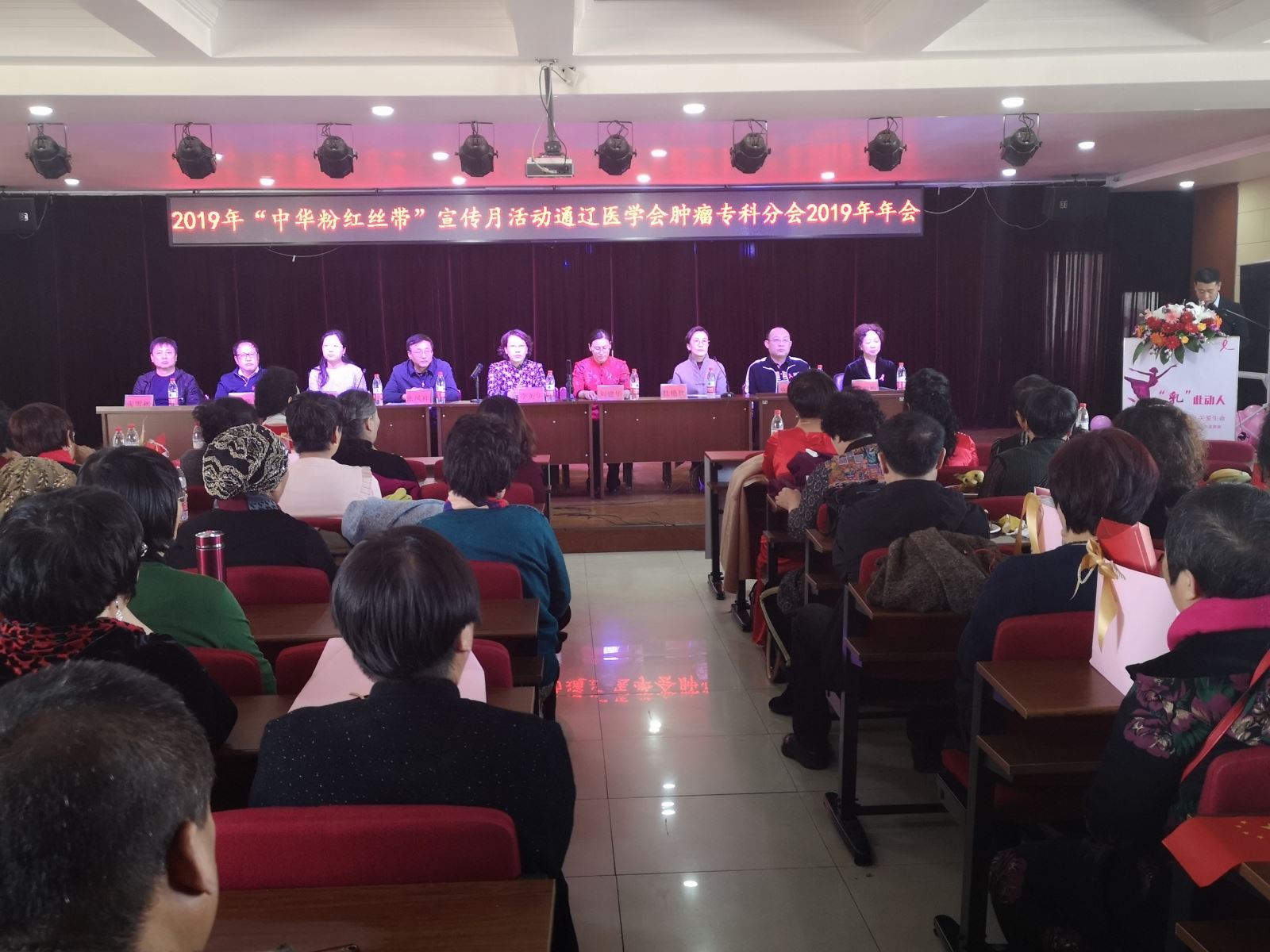 为推动社会各界共同关注女性乳腺健康,共同防治乳腺癌,让更多的人了解乳腺癌,关心、关爱、关注女性健康。10月26日下午,我院乳腺甲状腺外科、肿瘤放疗科在市老干部活动中心五楼会议室举办2019年“中华粉红丝带”宣传月活动暨通辽医学会肿瘤专科分会年会。通辽市医学会会长李英华、通辽市妇联副主席刘建华、通辽市妇联女工部部长刘春晓、通辽市医学会科技教育科科长张一鸣、我院副院长张凤祥、副院长杜艳秋、肿瘤放疗科主任王丽梅、乳腺甲状腺外科副主任李彦昕、肿瘤放疗科副主任张雪彬出席会议。相关科室医护人员及病友200余人参加会议,会议由乳腺甲状腺外科副主任医师张立主持。