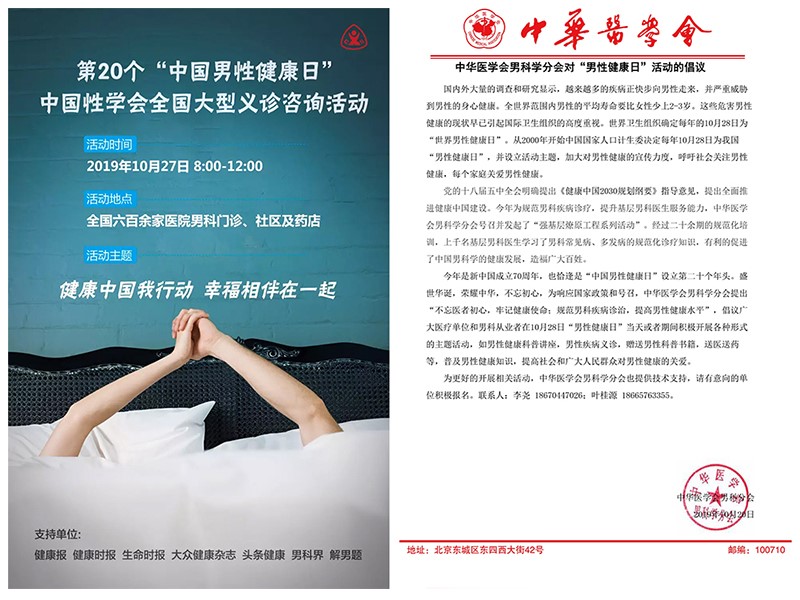 为庆祝中国男性健康日20周年,由中华医学会男科学分会、中国性学会、北京大学第三医院男科联盟、南京大学鼓楼医院男科联盟共同发起,联合全国六百多家医院共同实施,中华医学会男科分会、中国性学会及男科联盟领航定向发布了2019年度中国男性健康日主题 —“健康中国我行动,幸福相伴在一起”。