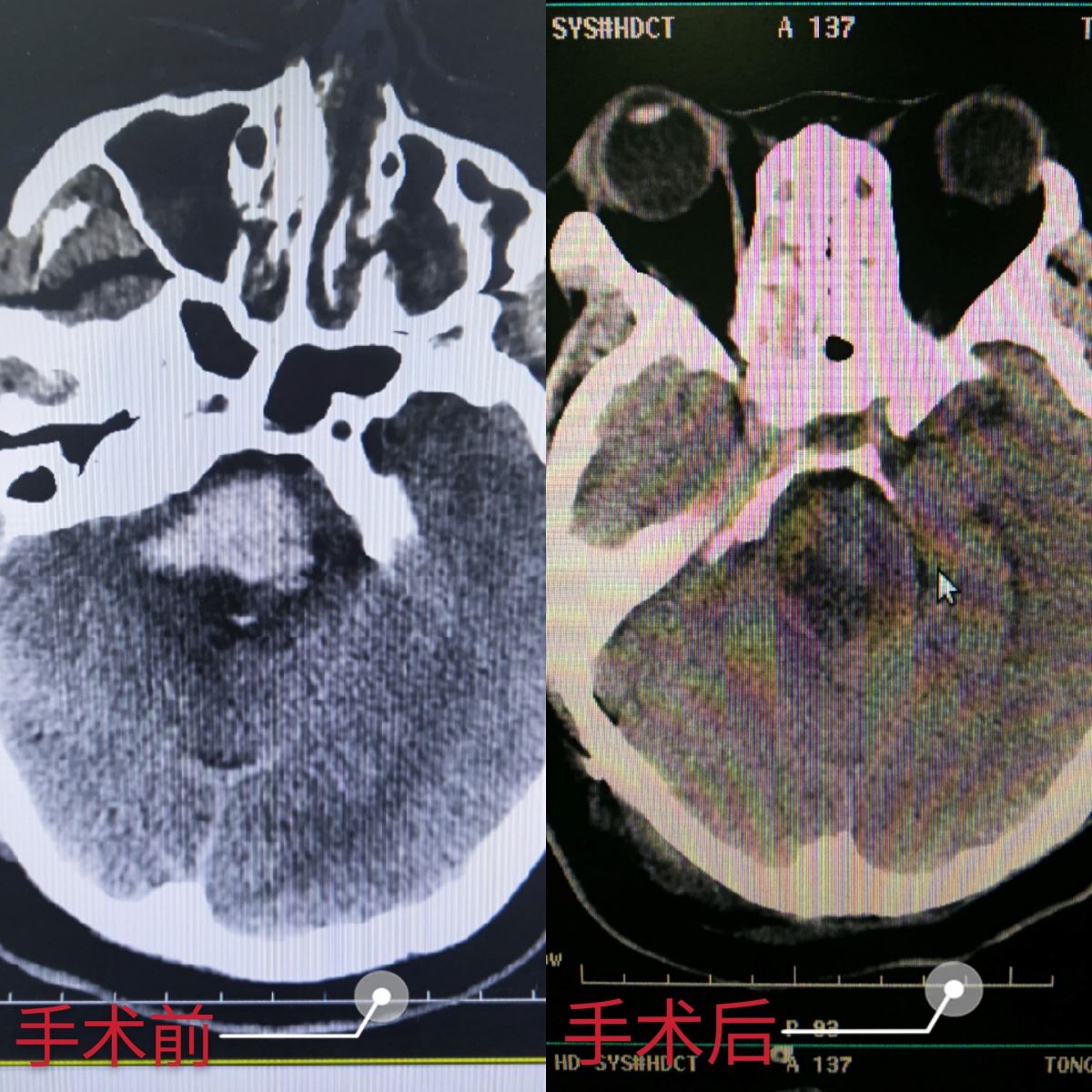 患者女性,38岁,为一名医务工作者,在值班期间突然发病,因恶心、呕吐、头痛伴意识模糊,入住我院急诊EICU,初步诊断为脑干出血。因患者病情较重,入院两天后复查CT,脑干出血明显增多,一般脑出血患者出血量5ml的致死率为90%,该患者的出血量已接近15ml,严重危及生命。我院神经外科赵林副主任医师会诊后建议马上进行手术治疗,经赵林医生耐心细致地与患者家属沟通,面对唯一的生机,患者家属决定放手一搏。手术由天坛医院李俊杰主任医师及赵林医生共同完成,顺利为患者在全麻下进行右侧枕下乙状窦后入路脑干血肿清除术,经过3个多小时的手术,成功为患者清除血肿。尽管手术难度较大,但赵林医生凭借自己丰富的临床经验,精准定位,进入血肿腔,在保护好脑干的前提下,顺利为患者清除血肿,将患者从死亡线上拉了回来。术后,患者进入ICU观察治疗。经过一周的治疗和恢复,目前患者可自主眨眼,有咳痰反应,已脱离呼吸机恢复自主呼吸,病人情况正在逐渐好转。