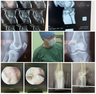患者,成年男性,由于行走踩空导致左膝关节损伤,左膝伸直屈曲受限,多次就诊北京及通辽市各大医院,由于经济费用原因未手术,症状逐渐加重,后受伤约1个月后来我院骨二科就诊办理住院,入院时左膝关节固定于屈曲30度位无法伸直,屈曲可达90度,膝关节活动受限,查体患者:左膝前Lachman试验阳性,终末点软性,轴移试验++,后lachaman阳性,前抽屉试验阳性,膝外侧副应力试验阳性,半月板研磨试验阴性。其余未见异常。患者入院后完善相关术前检查后,科室张继锋主任带领苗二春副主任医师组织科室进行术前讨论及查房,由苗二春副主任医师主刀,房芳主治医师协助,手术在腰硬联合麻醉下进行,麻醉成功后,取左膝关节髌上内侧入路,置关节镜,依次探查髌上囊、髌股关节、髁间窝、内、外侧间隙,见前交叉韧带止点处,胫骨髁间棘撕脱骨块,骨块上翘,(属于胫骨髁间棘骨折III型)刨刀清理骨折面,将骨块复位,见前交叉韧带张力良好,无需加深骨床,在髌骨内侧缘在膝关节屈曲90度位置沿骨块中心打入一枚空心螺钉导针,观察复位良好,沿导针拧入一枚直径3.5mm空心螺钉,探钩牵拉前交叉韧带见张力良好,骨块稳定解剖复位,探查后交叉韧带未见异常。内、外侧半月板边缘磨损,无破裂。术毕,出血10ml,手术时间40分钟。术后左膝关节即刻可伸直0度,屈曲100度。术后3天即可行膝关节屈身功能锻炼,由于有坚强的内固定,术后病人6周即可负重行走。大大缩短了患者康复和治愈的时间,空心钉价格低廉,较以往锚钉固定减少高值耗材使用费约90%左右,缩短治愈时间约50%,由于钛质空心钉组织相容性良好,及胫骨平台软骨下骨坚硬骨质的特征,可不必取出,避免二次手术时患者的痛苦及经济负担。目前患者恢复良好,康复训练膝关节伸直0度屈曲110度,患者满意度高。