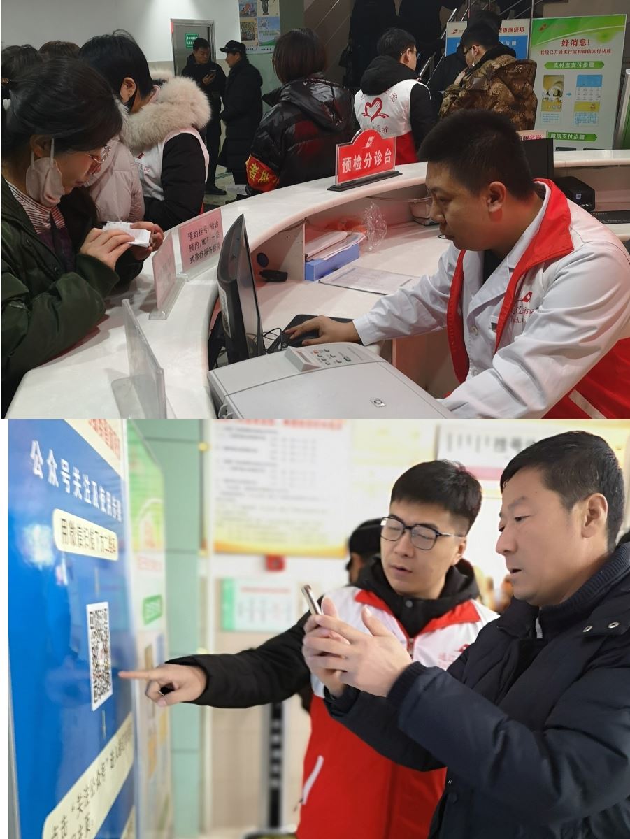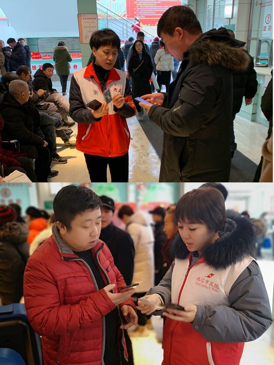 “您好,请问您想去哪个科室就诊?”“微信挂号、缴费不用排队,您可以了解一下。”门诊大厅内,穿着红色通辽市医院志愿者马甲、佩戴红色袖标的志愿者们协助分诊护士维护良好的就医秩序,向来院就诊群众推广我院官方微信,为市民们热情、耐心地讲解如何利用微信公众号快捷地进行门诊挂号、预约挂号、缴费,帮助患者了解出诊医生实名制、就诊流程、诊室路线、自助取单机的使用等多方面信息需求,为患者提供温馨、优质、高效的医疗服务。“志愿者们向我介绍了微信公众平台,我马上扫码关注,使用后发现真的非常实用,再也不用一大早到医院排队挂号了。”黄女士高兴地说。活动期间,我院张双青副院长全程参加现场指导,把“为患者服务”理念落到实处,极大地缓解了门诊就诊高峰压力,帮助患者顺利、便捷就医。