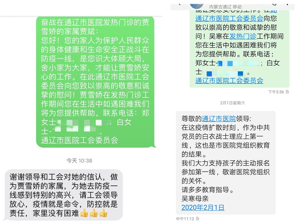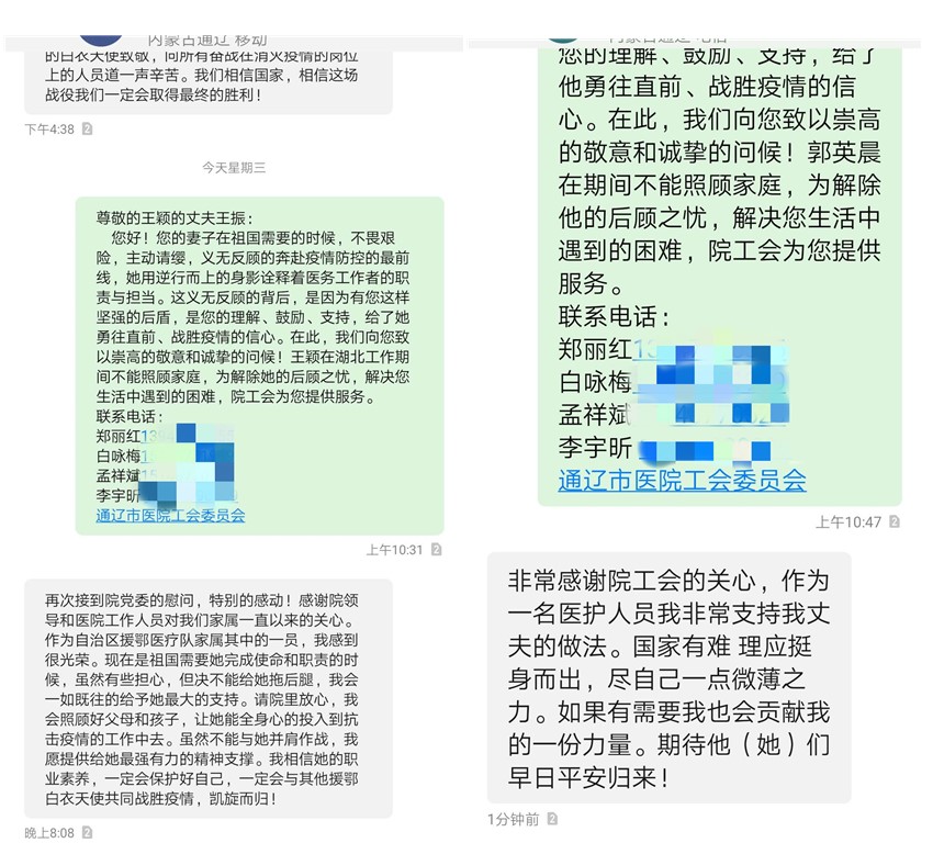 院工会做为战斗在疫情一线的医务人员的“娘家人”,为解决他们的后顾之忧,向工作在一线不能回家的志愿医护人员家属们发去一封慰问信。感谢他们对医院工作的支持,对防疫工作做出的贡献,院工会向他们致以崇高的敬意和诚挚的慰问并承诺:在生活中如遇困难,院工会定会提供帮助做好后勤保障。院工会向援鄂医疗队队员和发热门诊的一线战斗医护人员及家属发送慰问信息65条,收到回复电话1个、回复信息30余条。收到慰问信的家人们没有一人提出生活上的困难,也纷纷对医院的关怀表示感谢,表示相信医院的防控措施,一定照顾好家庭,做好一线队员战胜疫情最坚强的后盾。