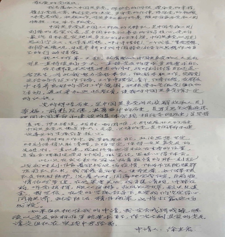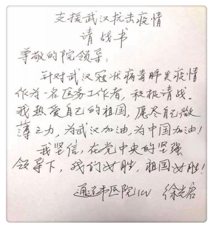 徐光启,通辽市医院重症医学科副主任医师,面对疫情,她第一时间递交了请战书,她这样写道:“尊敬的院领导,针对武汉新型冠状病毒肺炎疫情,作为一名医务工作者,我积极请战。我热爱自己的祖国,愿尽自己微薄之力,为武汉加油,为中国加油!我坚信,在党中央的坚强领导下,我们必胜,祖国必胜!”短短的几行字,蕴含了病毒猖逆,英雄无畏的精神。从递交请战书的那一刻,她已做好奔赴湖北的准备。知道她的决定后,在一起生活的公婆忧心忡忡,茶饭不思,担心儿媳会有危险,同是医务工作者的爱人则非常支持他的决定,虽然心中有不舍、有担忧,但还是耐心地开解二老。都是父母的孩子,都是孩子的父母,谁不想守在亲人的身旁呢?可身上的白大褂承载着一份沉甸甸的责任,一份不能轻易放下的责任。医院是战场,作为战士,我们不冲上去谁上去?拥有60多年党龄的钟南山告诉公众“尽量不要去武汉”,自己却义无反顾地冲到了最前端。“把所有人都换下来,共产党员上!”上海医疗救治专家组组长、华山医院感染科主任张文宏硬核发声,他们用亲身行动诠释着入党誓言。这一切都感动着徐光启,出征前一天,她写下了入党申请书,郑重地交给了院党委。2月17日,徐光启作为通辽市第四批援鄂医疗队的队长,在出征仪式上,她庄严地接过援鄂医疗队队旗,肩负使命奔赴千里之外的湖北武汉,冲向抗战新冠肺炎的最前线。集结号已吹响,临行时她说:“我要以一名共产党员的标准严格要求自己,带好这支援鄂医疗队,圆满完成救治任务,而且要把他们平平安安带回来。”在祖国召唤的时候,当人民需要的时候,这样一支队伍将全力以赴、冲锋在前,让党旗在防控疫情斗争的第一线高高飘扬!