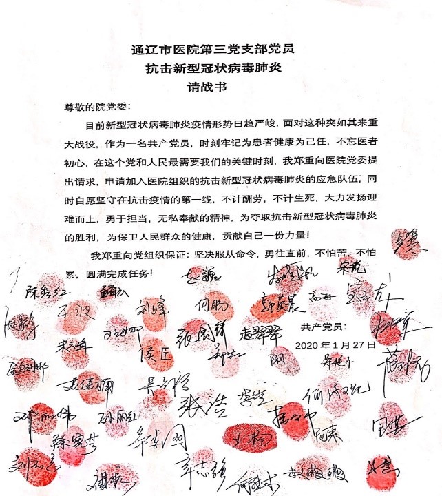 1月23日,武汉疫情加重,宣布“封城”,全国医护人员取消春节假期,“最美逆行者”接连到岗,即刻进入战备状态。通辽市医院第一时间成立了新冠肺炎防控应急工作领导小组,并按照上级部门指示成立医疗救治专家组,有着呼吸相关疾病丰富诊疗经验的何佳木,责无旁贷地成为新冠肺炎医疗救治专家组的成员之一。作为科室骨干的他虽然业务工作繁忙,但是仍然积极投身于防控新冠肺炎的第一线。由于疫情的不断变化,国家版的诊疗规范、防控措施及转诊流程要随时进行相应调整,他深入研读每一版的《新型冠状病毒感染肺炎诊疗方案》,每当国家对诊疗方案调整时,他便牺牲休息时间,不厌其烦一遍遍地现场授课、录制音频、视频,给全院职工进行最及时的宣教培训。截止到出发去武汉之前,何佳木录制的课程已经超过7000人次观看,援鄂医疗队、通辽市新冠肺炎医疗救治梯队、进入发热门诊医护人员的专题培训中都留下了何佳木讲课的身影。疫情发生以来,他几乎没怎么回过家。当得知要组建援鄂医疗队时,他主动请战,请战书上他写道:“我自愿坚守在抗击疫情的第一线,不计酬劳、不计生死,不忘医者初心,为保卫患者健康贡献自己的一份力量。”没有华丽的辞藻,也没有豪言壮语,在请战书上按下红手印的那一刻,他不仅仅是别人的儿子、丈夫和父亲,还是一个英勇无畏的冲锋者。