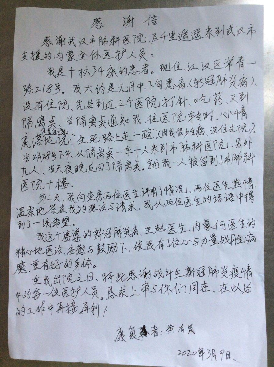 在我出院之日,特此感谢战斗在新冠肺炎疫情中的每一位医护人员。恳求上帝与你们同在,在以后的工作中再接再厉!
