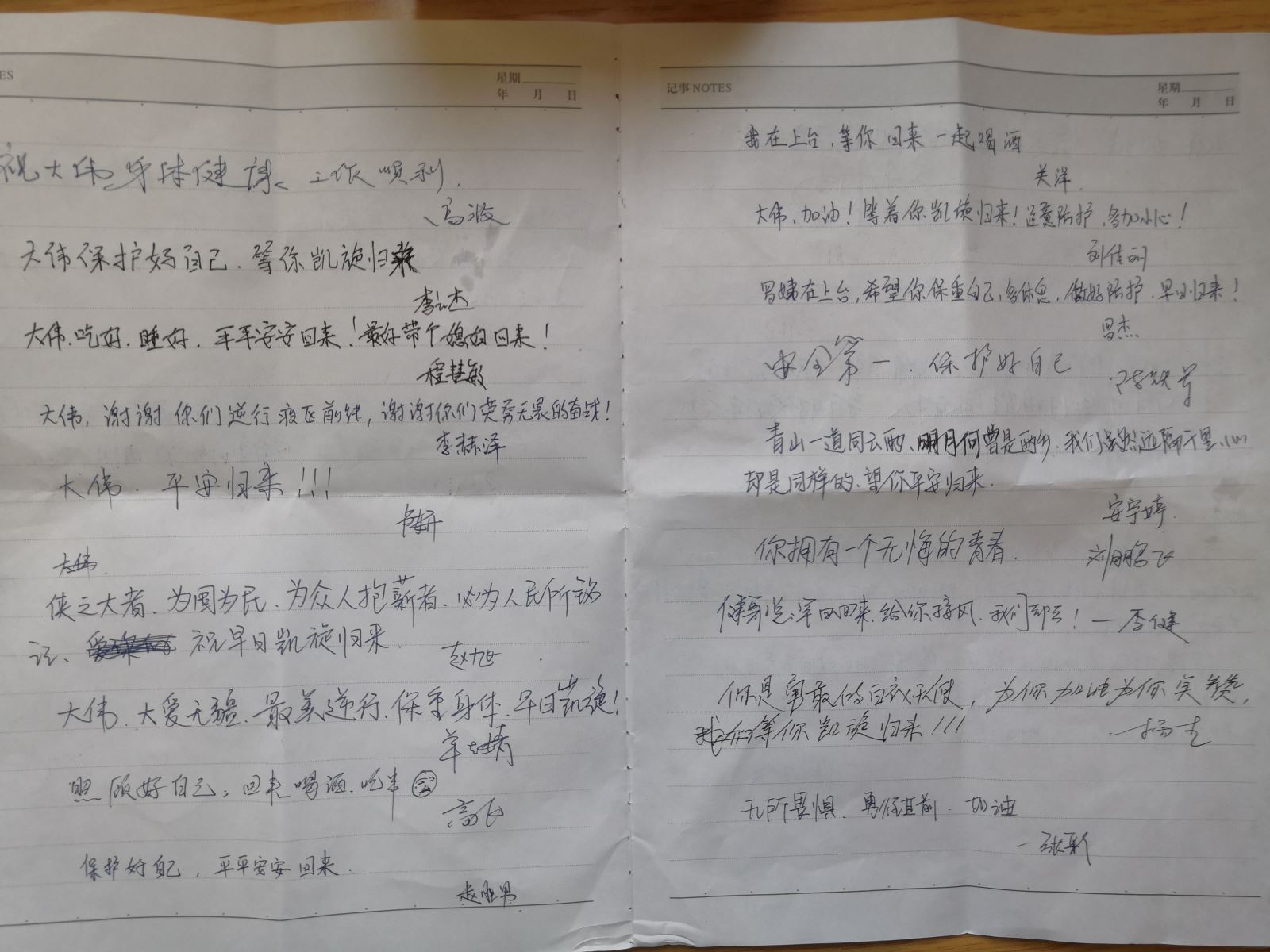宋大伟在武汉市肺科医院工作的这段时间,每天都会向家里报个平安,即使工作、生活再忙再累,他都是报喜不报忧。家人们对他也是加油鼓劲,父母告诉他:“我们都很好,你们单位领导来家里慰问,送来了慰问品,还打电话关心我们的生活,有什么困难需要解决。我们都挺好,你自己做好防护,好好工作。”听到这些,大伟的心暖暖的,也特别踏实。前几天,宋大伟收到手术室同事们给他寄来的一个大大的包裹,里面有各种生活物品和大伟爱吃的食品。在拆开包裹的时候,里面有一封信,上面写满全科室51人鼓励和祝福的话语,见字如面,宋大伟读完后,潸然泪下,字里行间充分体现了手术室全体人员对大伟的爱和惦念。收到大家不远千里给他邮寄来的物品,大伟夜里辗转反侧,写下了一首抗疫诗词: