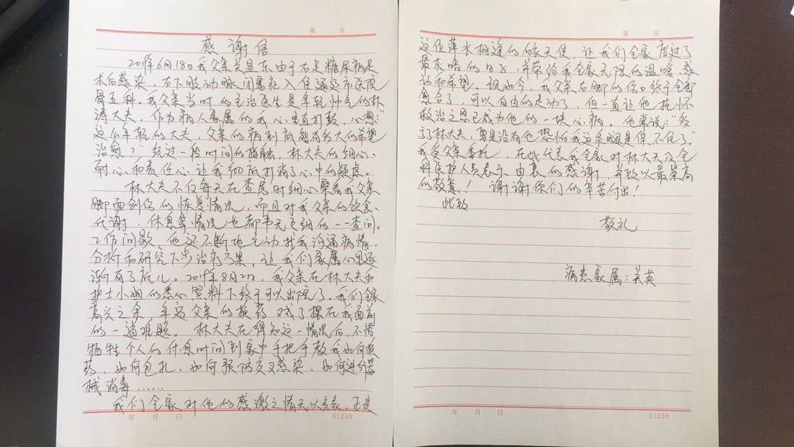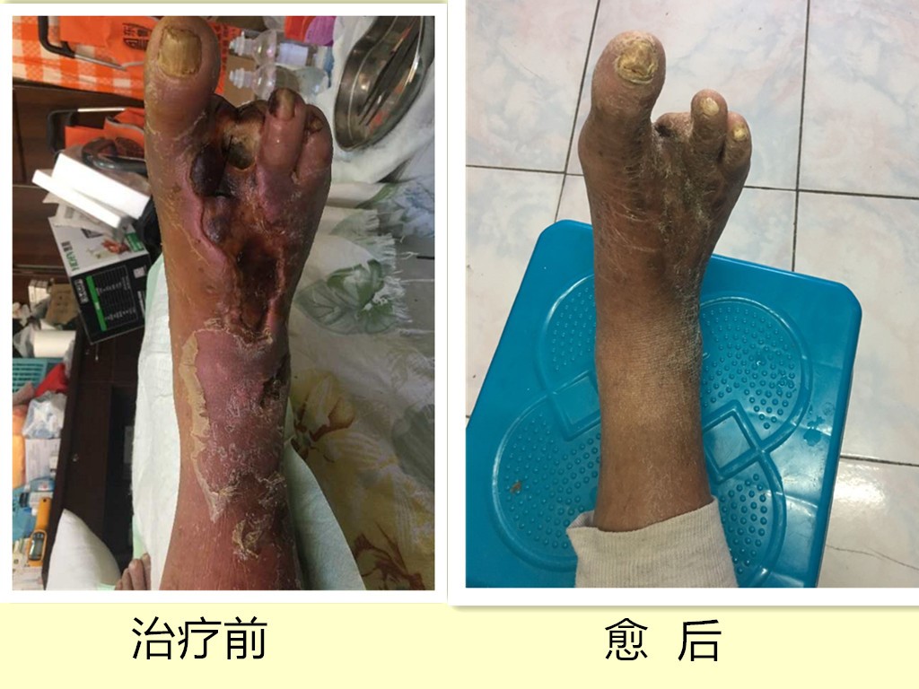 患者,70岁,糖尿病病史多年合并脑血栓、下肢动脉闭塞,足趾坏死曾在沈阳医大医院行二、三足趾截趾手术,术后伤口及足背大部分皮肤坏死,溃疡创面加重,足趾坏死,经医大医院建议行小腿截肢手术,患者及家属拒绝行截肢手术,辗转来到我院骨五科治疗, 由主治医师林涛接诊。患者入院时足背皮肤大部分坏死,足底可见溃疡创面,脓性渗出,骨外露,情况十分不好。入院后在给予创面反复换药、清创、负压吸引后,患者创面基底血运逐步恢复良好。在与患者及家属反复沟通病情后, 凭借林医生在积水潭医院烧伤科进修时学到的专业知识及丰富的经验,决定采取保肢治疗。于腰麻麻醉下行创面扩创、大腿取皮植皮手术,移植皮瓣于足部创面,无菌敷料包扎、负压吸引装置,术后随时根据病情变化精心护理,密切观察病情、监测血糖,在一周后取下负压装置,植皮皮片成活良好。因创面修复及植皮皮片成活比预期恢复的还要好,患者半个月就可以下地行走了。出院后,林医生更是多次去患者家中为其换药直至创伤痊愈。目前,患者保肢治疗成功,已恢复正常行走。患者家属看到已经被判定必须截肢的腿保住了,内心万分感激。专程送来了感谢信:感谢市医院培养出来的好医生、好大夫,称赞林涛大夫真是医德高尚,不怕脏、不怕累。对每一位病人很细心,很关心。