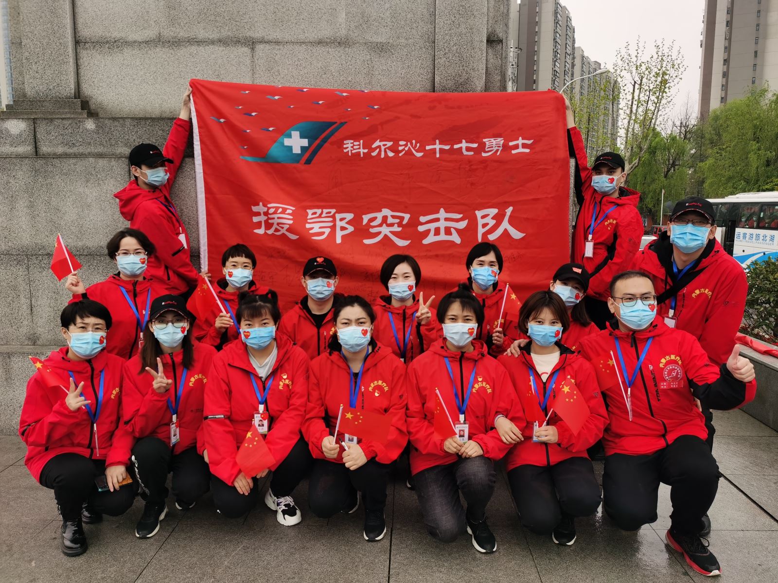 肩有责任,使命必达。我院援鄂医疗队17名医护人员经过41天的日夜奋战,大家各司其职,共同参与和见证了武汉这座城市的苏醒。队员们团结协作、齐心协力,克服了工作和生活中的种种困难,实现了出征时零感染、零损伤的诺言。他们具有丰富的呼吸科、重症医学科的救治、护理经验,得到了武汉市肺科医院重症医学科胡明主任、钟小锋护士长及援鄂医护同仁们的高度肯定和赞扬,患者们一封封的感谢信也是对医疗队员们最大的鼓舞。日月同天,蒙鄂情深,我院科尔沁十七勇士援鄂突击队签名队旗被武汉市硚口区人民政府收藏至当地博物馆。