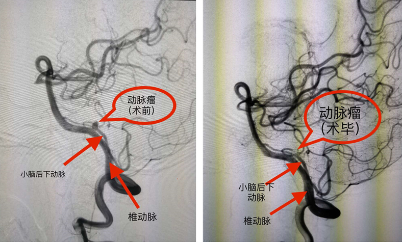 颅内动脉瘤是神经外科一种常见病、多发病,是指颅内动脉内腔的局限性异常扩大造成动脉壁的一种瘤状突出。颅内动脉瘤多因颅内动脉壁局部的先天性缺陷和腔内压力增高的基础上引起囊性膨出,是造成蛛网膜下腔出血的首位原因。颅内动脉瘤手术难度大,风险高,特别是后循环(椎-基底动脉)动脉瘤,一旦术中瘤体破裂或载瘤动脉闭塞,随时危及生命,对术者技术及心理要求极高。因小脑后下动脉主要供应小脑的后下面、小脑扁桃体、同侧小脑下蚓部和延髓外侧面血液,而延髓是人的呼吸循环中枢,一旦引起小脑后下动脉闭塞,危及生命,后果不堪设想。本例椎动脉瘤栓塞术的成功说明我院在颅内动脉瘤介入治疗方面更加成熟和精准。