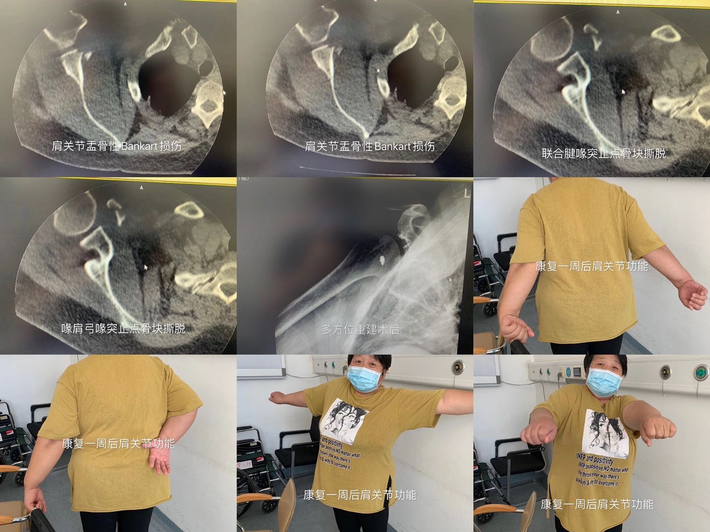 患者成年女性,摔伤后右肩关节脱位,疼痛肿胀,后复位,肩关节活动受限,自感肩关节活动时锉动明显,在家休养数天后症状不缓解,到骨二科就诊住院,入院后结合检查肩关节辅助检查结果诊断为:右肩关节不稳症;右肩关节盂前下方骨性Bankart损伤(骨性缺损约20%);联合腱喙突止点骨块撕脱;喙肩弓喙突止点骨块撕脱。核磁检查提示有肩周围肌群损伤。查体:右上肢Neer征阳性、右侧Sucus征(+)、右肩抽屉试验(+++)、恐惧试验(+)、Jerk试验(-)、Speed试验(-)、右肩Jobe征(-),右肩关节极度前方不稳定,入院后完善相关检查后行右肩关节前方骨性Bankart损伤重建术、联合腱喙突止点解剖重建术、喙肩弓喙突止点解剖重建术、术后病人恢复良好,肩关节功能恢复良好,该病人肩关节前方稳定结构损伤严重,肩关节极度不稳定,该手术应用喙突前6cm单一切口解决三处解剖重建手术,切口小,损伤小,手术时间短、出血少、完全的解剖重建手术技术使得患者肩关节功能能最大可能的恢复,该手术技术处于自治区领先水平。