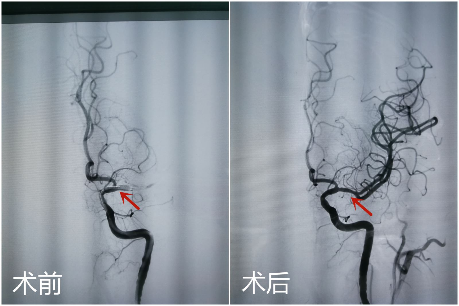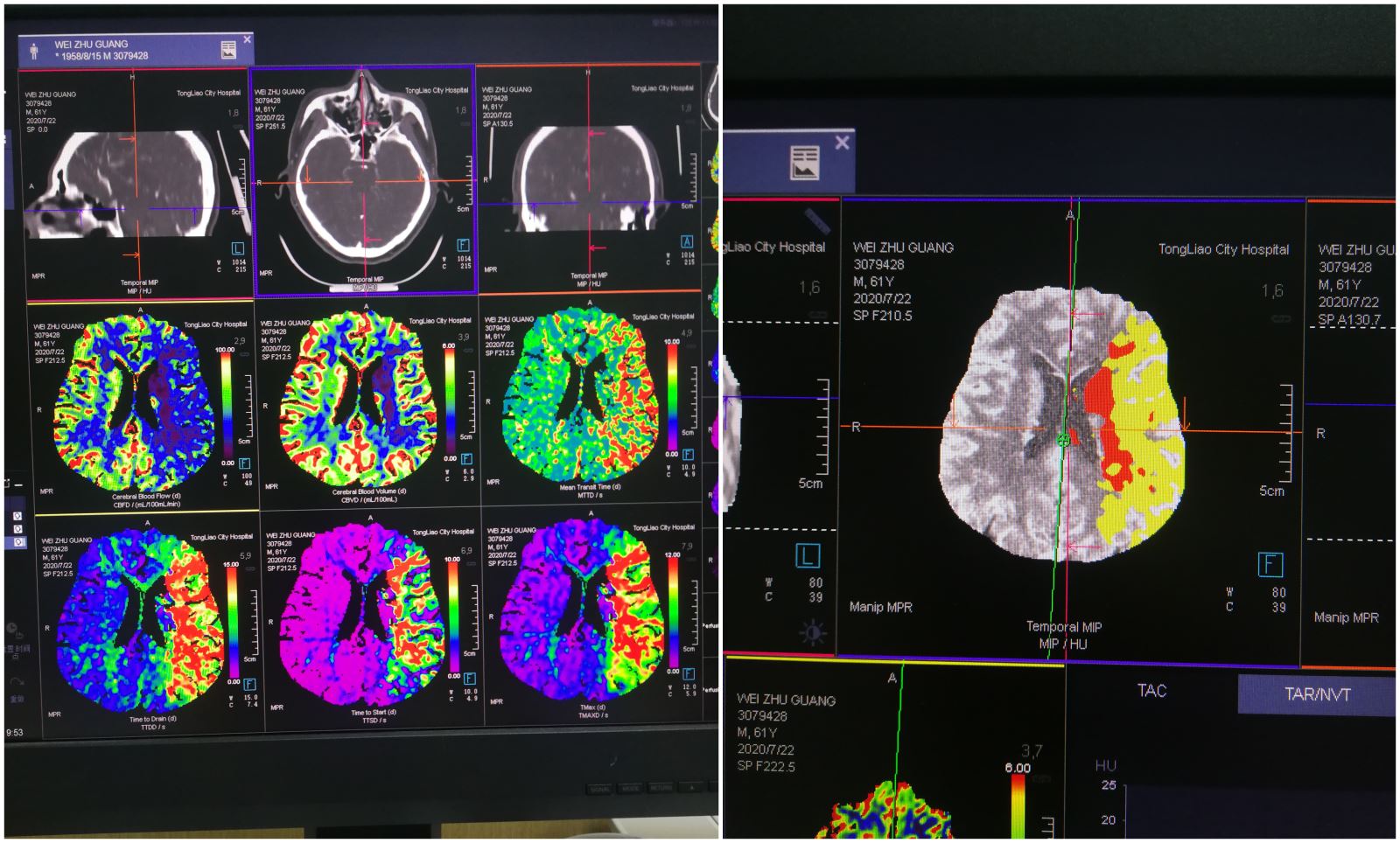 患者魏某,男性,61岁,于冲澡时出现失语,右侧肢体活动不灵后摔倒,急拨打120来院,我院立即开通卒中绿色通道,完善头部CT检查后初步诊断脑梗塞。急性脑梗塞致残、致死率极高,愈后功能恢复与发病时间密切相关,如不及时救治,预后极差。此时距离发病时间约有1小时,经家属同意后,神经内三科白塔娜医生立即给予患者阿替普酶紧急静脉溶栓治疗,并完善头部CTA+CTP检查,提示左侧大脑中动脉闭塞,与此同时通知介入导管室做好急诊手术准备。溶栓后再次评估NIHSS评分14分,患者临床症状改善不明显,在与家属充分沟通病情后,决定施行动脉取栓术,手术由神经内三科徐鹏医生主刀,李士伟医生协助。在为患者行全脑血管造影后,证实为左侧大脑中动脉闭塞,立即予以取栓术治疗。经过一个多小时的奋战成功将患者血栓取出,缺血区域血流迅速恢复畅通,缺血症状立即得到改善,取栓成功。患者术后恢复正常,取栓效果明显。