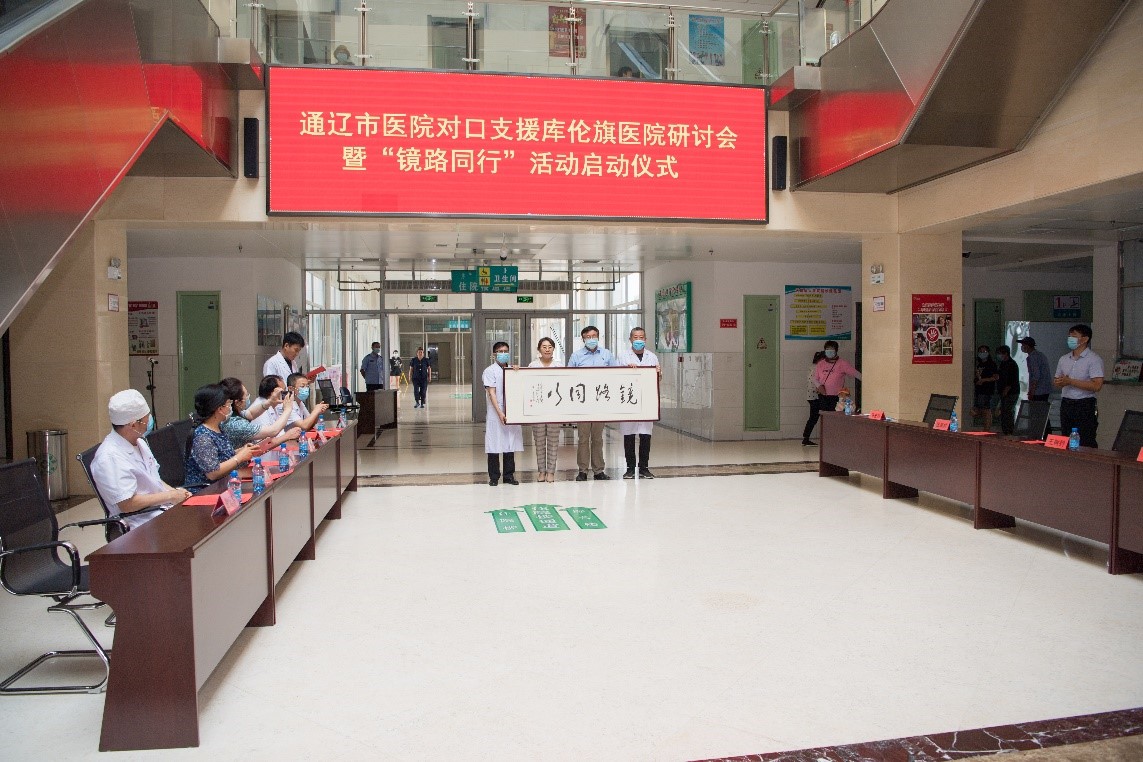 库伦旗人民政府副旗长哈申,旗卫健委主任顾秀英出席欢迎仪式并致辞。我院副院长张凤祥代表讲话并表示:库伦旗医院和通辽市医院是多年合作的对口支援关系,也是我院重要的医联体理事单位,做好对口支援并加快医联体发展、建设,为推动构建分级诊疗制度形成合理有序的就医格局,方便患者就医具有重要意义。随后,“镜路同行”启动仪式上马宏珍主任发言,并与张凤祥副院长一同向库伦旗医院赠送牌匾并合影留念。